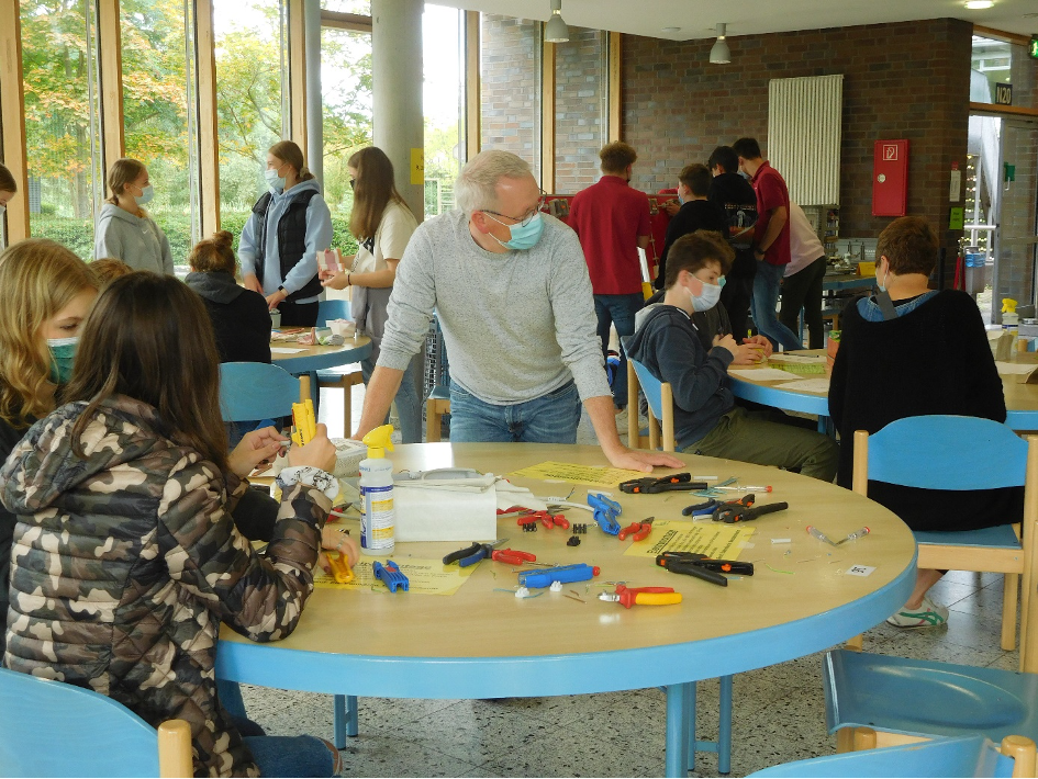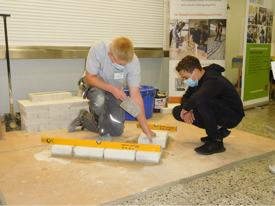 Es wurde gesägt und geschraubt, Schaltkreise wurden erklärt und aktuelle Auszubildende aus verschiedenen Berufen demonstrierten, wie Fliesen „geschnitten“ und Steine aufeinander gemauert werden. Sie brachten den interessierten Jugendlichen Hintergründe der Elektronik näher und informierten mit spannenden Aufgaben über Ausbildungsberufe in der Textilindustrie.