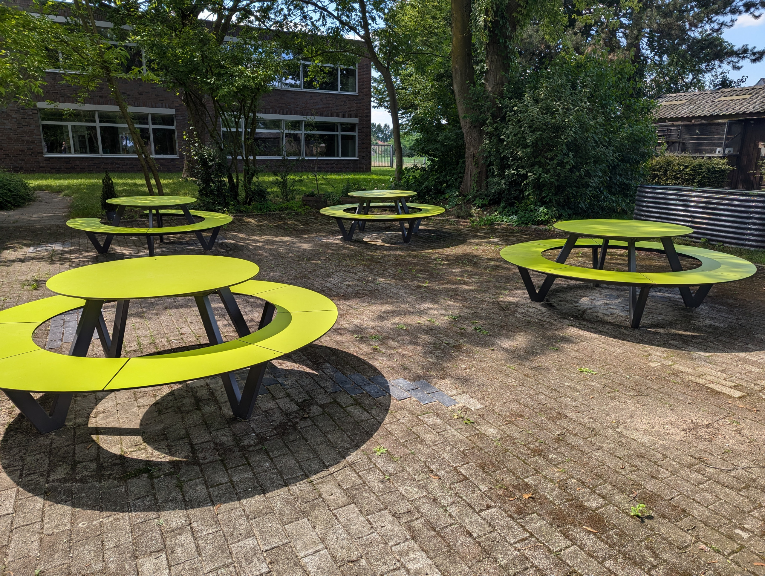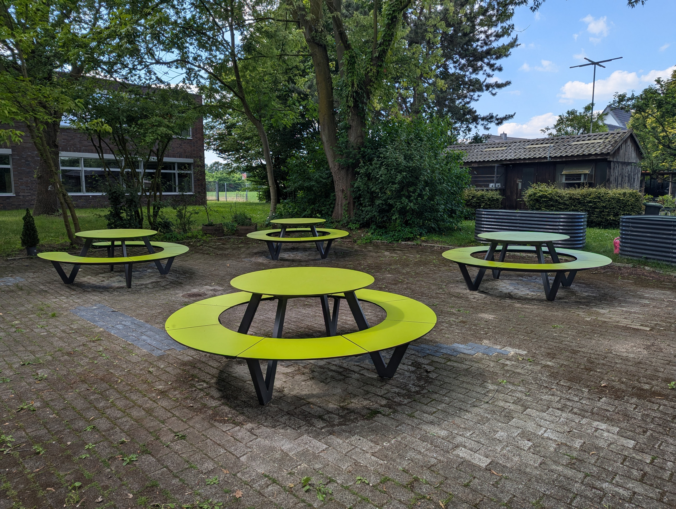 Wir freuen uns, dass wir wieder ein "Grünes Klassenzimmer" haben. Nachdem die alten Holzmöbel nach vielen Jahren nicht mehr nutzbar waren, machten wir uns auf, Außenmöbeln zu finden, die besonders witterungsbeständig sind. Wir stießen hierbei auf Möbel der Firma Miramondo. Die Möbel bestehen aus Hochdrucklaminat (HPL) und haben Eigenschaften, die für die Nutzung im Außenbereich prädestiniert sind.