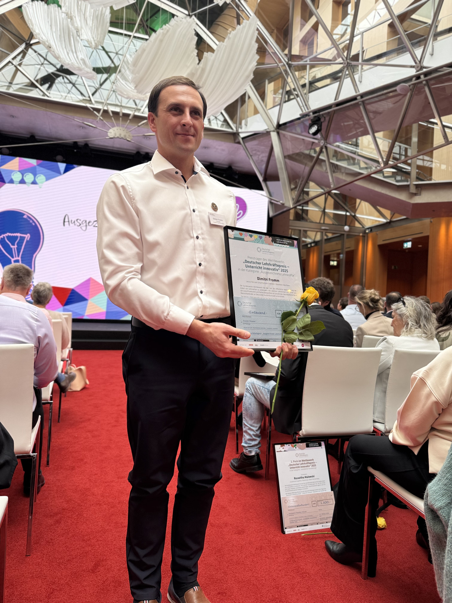 Zum 2.Mal nach dem Gewinn des Deutschen Lehrekräftepreise durch Annika Stuckmann, Laura Berressem und Lenny Liebig, die 2024 den Sonderpreis „Kulturelle Bildung” der PwC-Stiftung erhielten, gewann unser Physiklehrer Dimitri Fromm den Lehrkräftepreis 2025 in der Kategorie "Ausgezeichnete Lehrkraft".