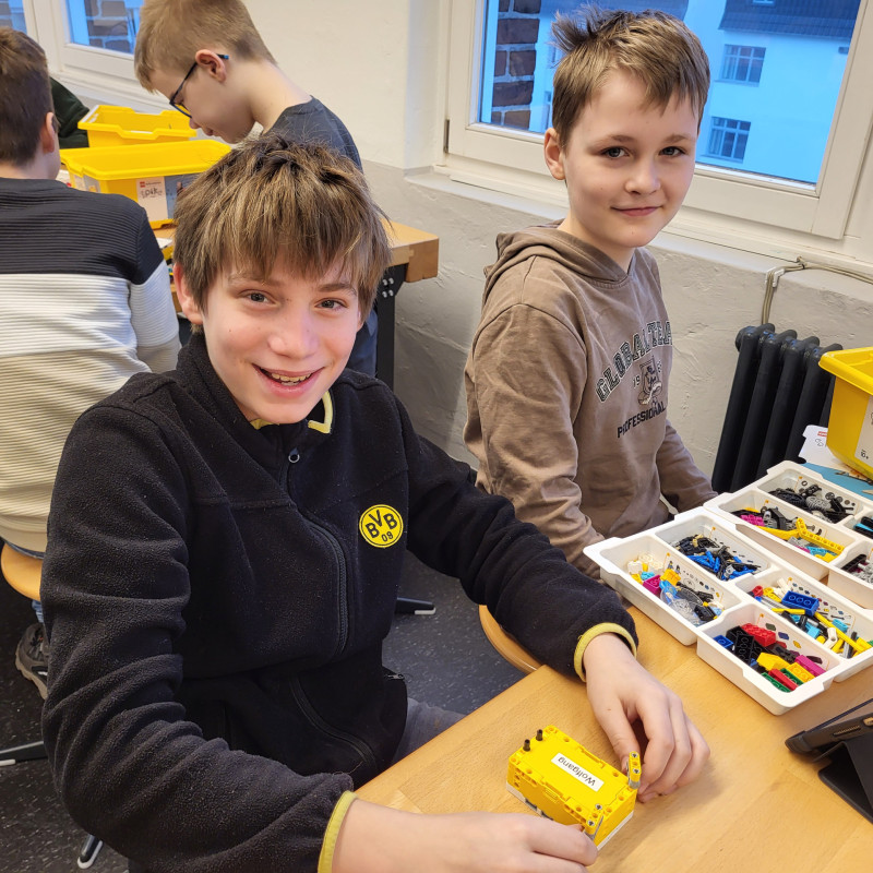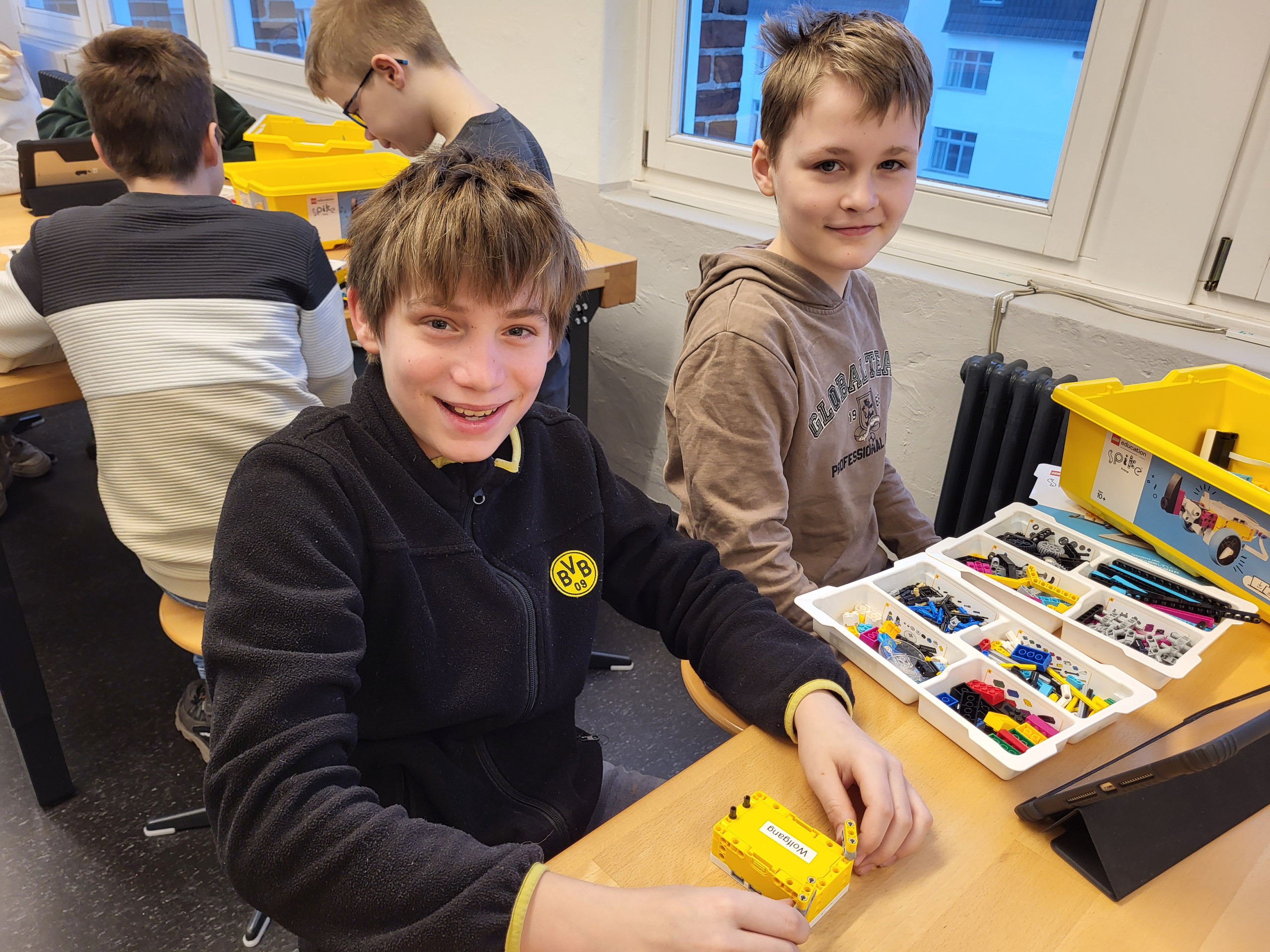 23 Schüler*innen des 6. Jahrgangs hatten die Gelegenheit, an der "Roboterwerkstatt: Bauen und Programmieren mit LEGO Spike" des Campus Gütersloh teilzunehmen. Begleitet wurden sie von Herrn Jäger und Frau Schwermann-Baar.