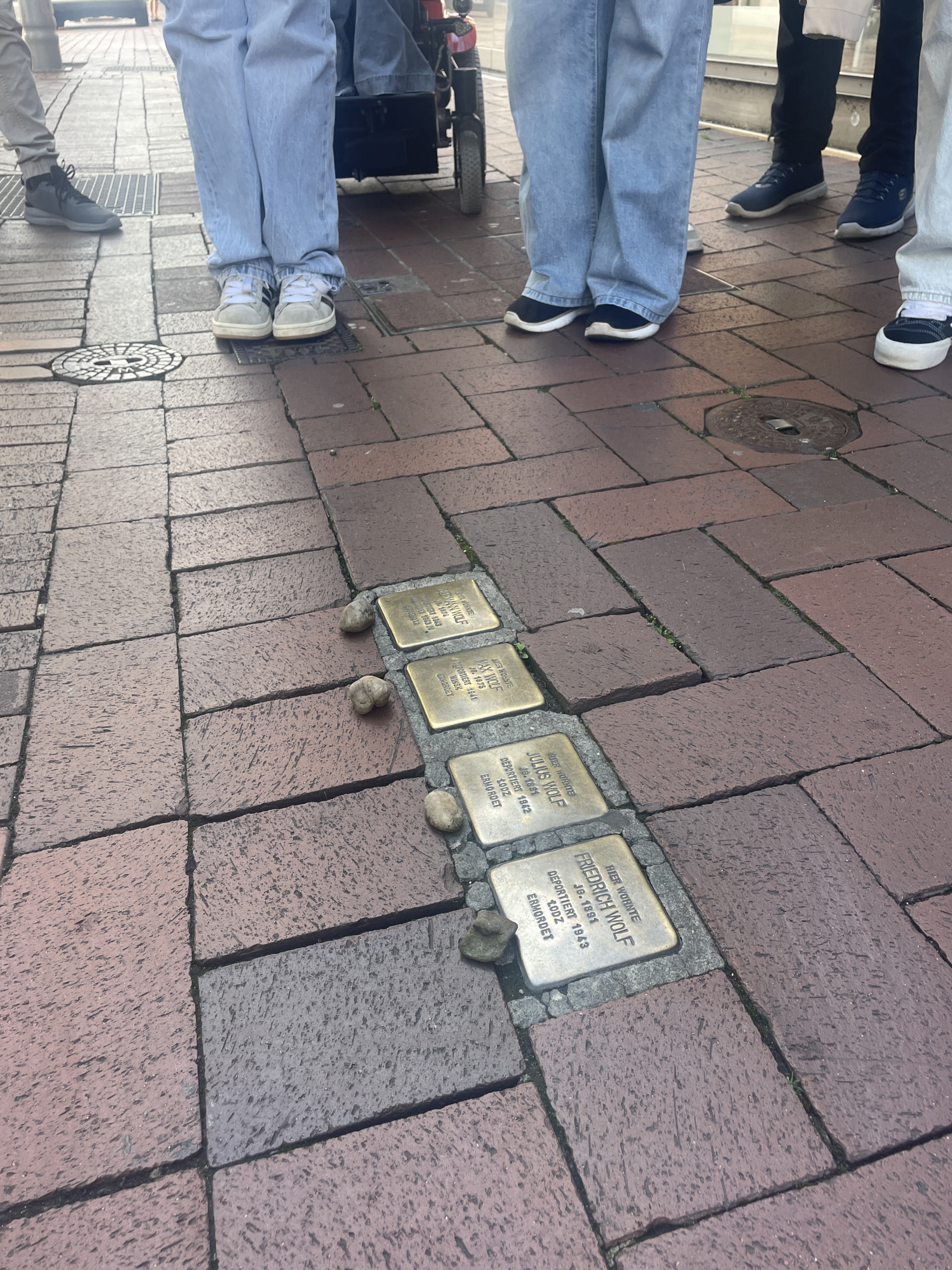 Sie waren auf der Suche nach kleinen Gedenksteinen, die im Straßenpflaster eingelassen wurden. Hinter jedem dieser sogenannten Stolpersteine stehen ein Name und eine Geschichte. Diese haben die Schüler/innen in kleinen Vorträgen vorbereitet. Alle diese Menschen wohnten in Gütersloh, waren Nachbarn und wurden von den Nationalsozialisten deportiert und ermordet.