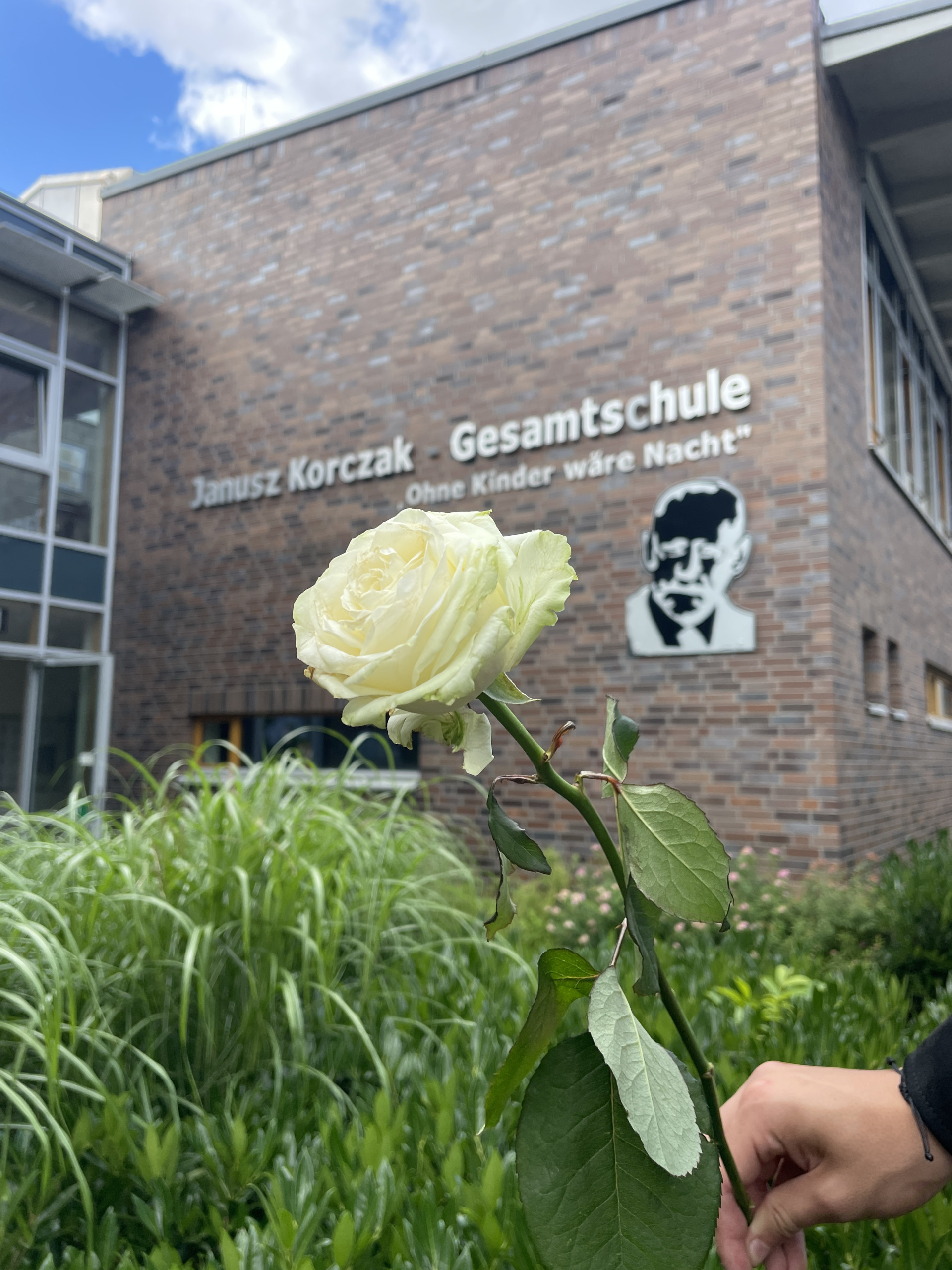 Den Abschluss des antifaschistischen Rundgangs bildete der Eingang unserer Schule. Janusz Korczak lebte zwar nicht in Gütersloh, aber er prägt unsere Schule jeden Tag.