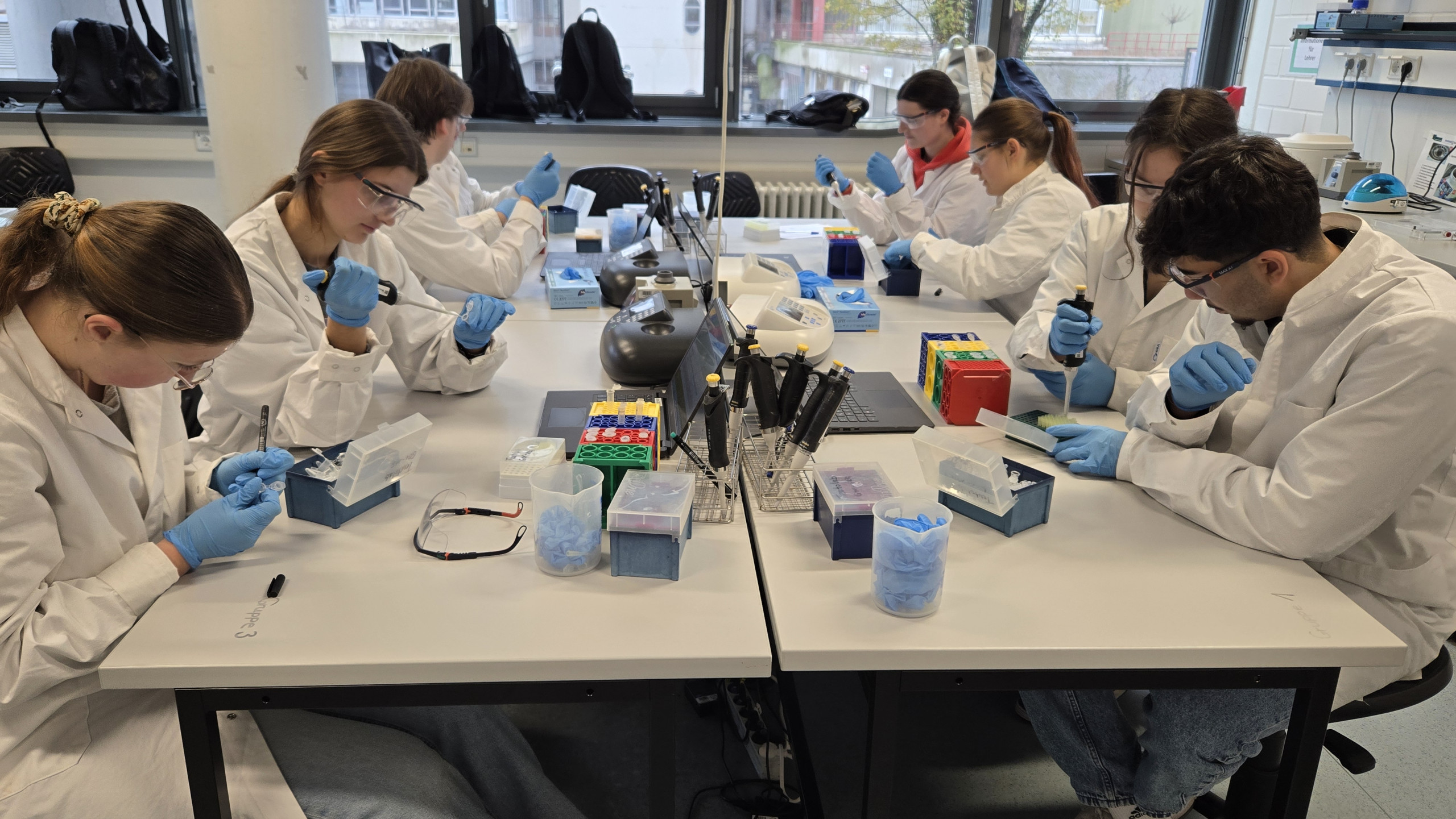 Während der Wartezeiten zwischen den einzelnen Arbeitsschritten wurde die Zeit sinnvoll genutzt, um den Schülerinnen und Schülern offene Fragen zu beantworten und die zuvor durchgeführten Methoden gemeinsam zu reflektieren. Zudem erklärten die wissenschaftlichen Mitarbeiter jeweils die nächste anstehende Methode, sodass die Teilnehmenden gut vorbereitet in die folgenden Versuchsschritte gehen konnten. Auf diese Weise wurde das praktische Arbeiten im Labor mit theoretischem Wissen verknüpft und das Verständnis der genetischen Verfahren weiter vertieft. Die im Labor gewonnenen Ergebnisse wurden den Schüler:innen später zur Verfügung gestellt und im Biologieunterricht ausführlich nachbesprochen.