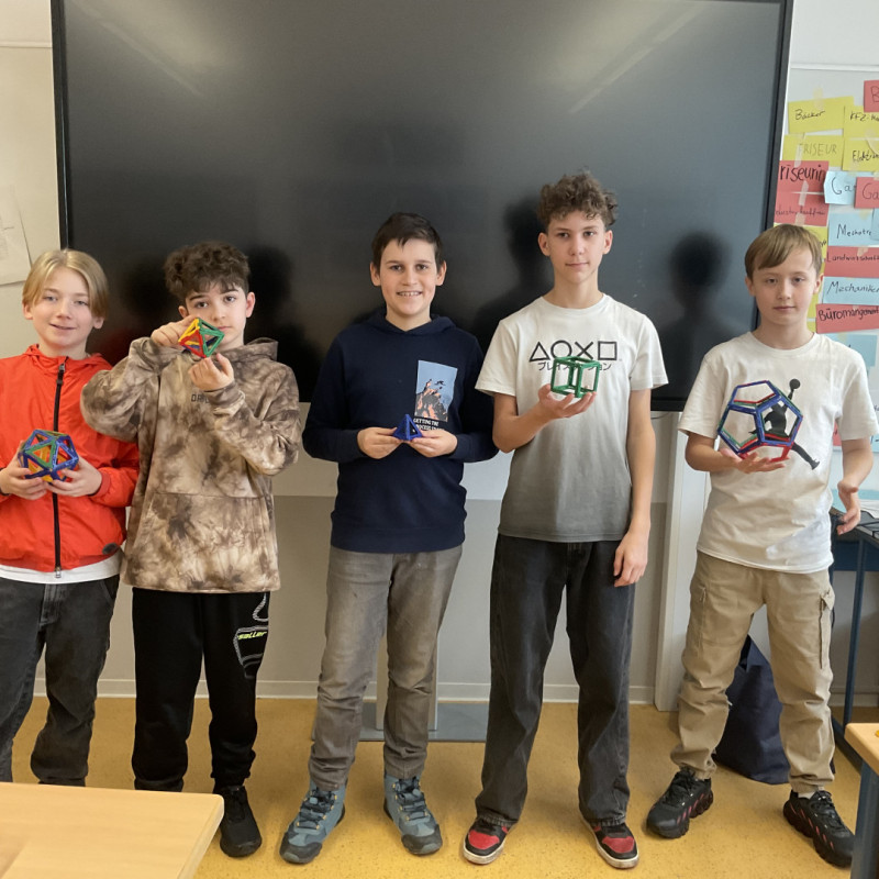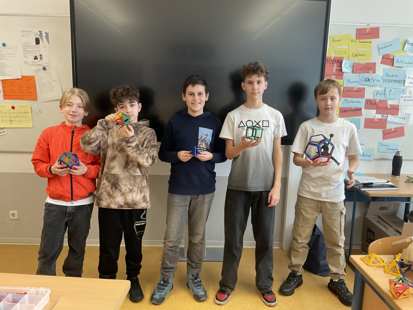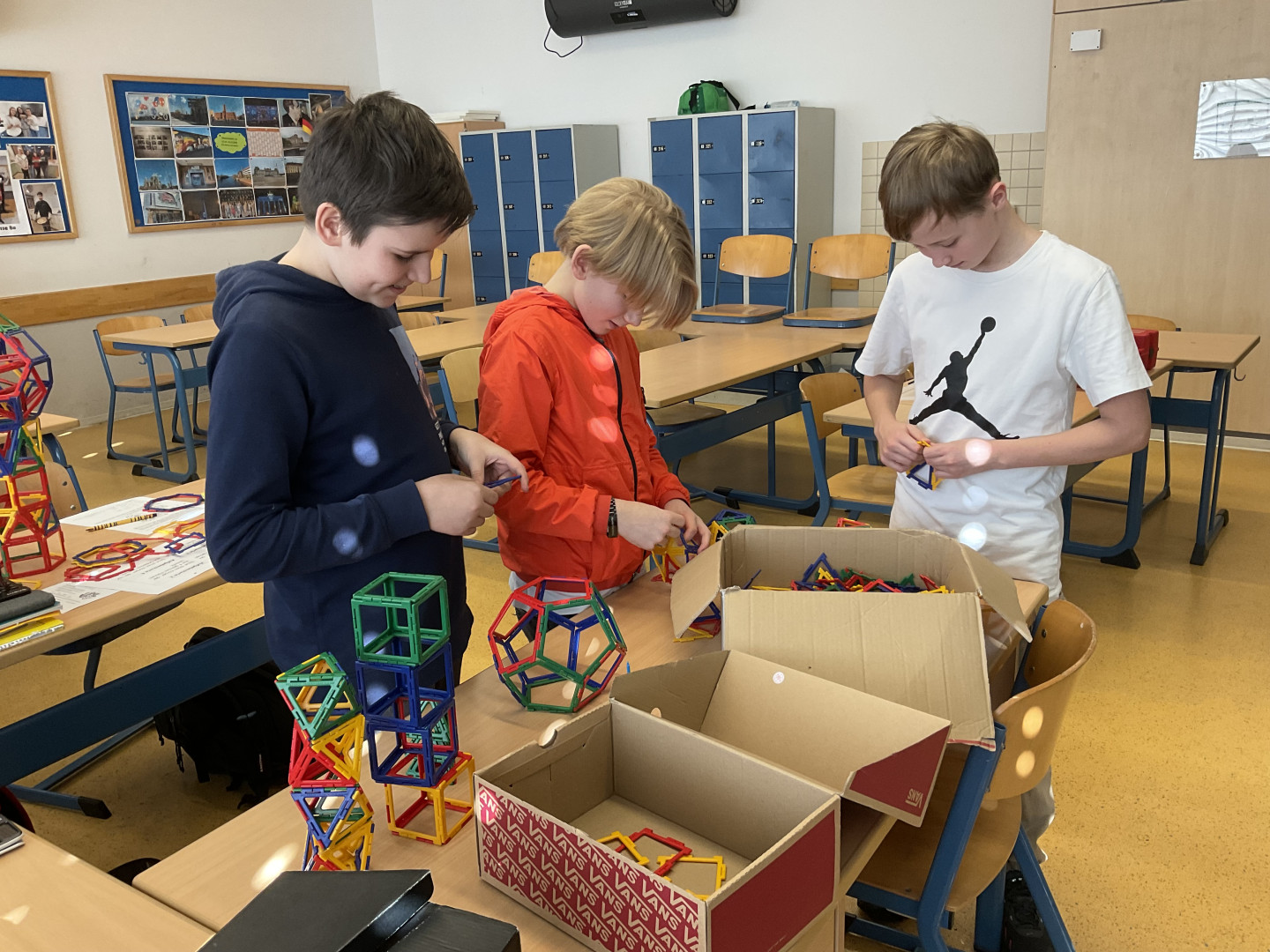 Die Gruppe „Platonische Körper" (Herr Robaczewski) baute sich durch die fünf klassischen geometrischen Körper, entdeckte dabei die Eulersche Polyederformel, beschäftigte sich mit konvexen und konkaven Körpern und wagte sich vereinzelt sogar an Archimedische Körper heran. Am Ende entstanden mathematische Kunstwerke, die eigentlich viel zu schön waren um sie wieder abzubauen.