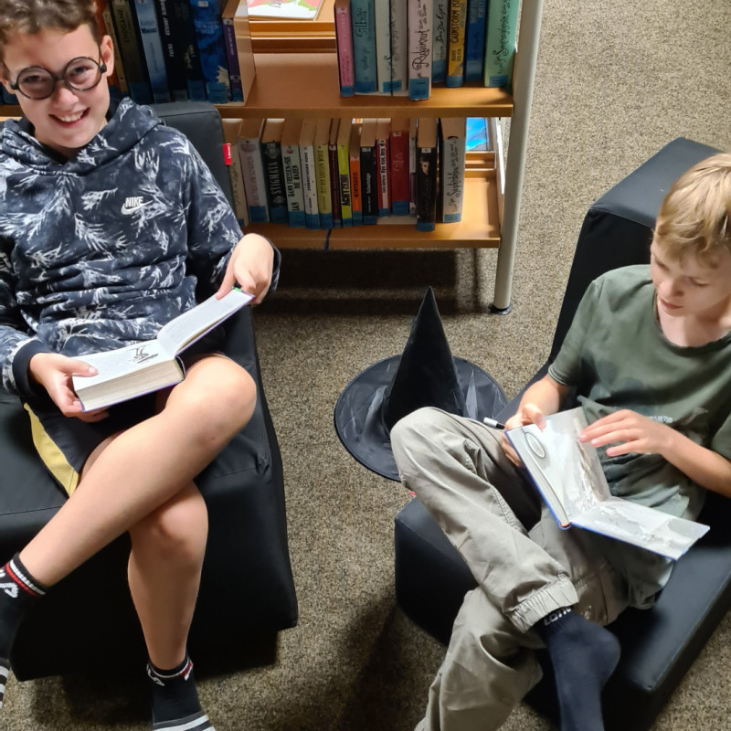 Die Schülerinnen des 5. Jahrgangs absolvierten während der Projektwoche ein vielfältiges Programm. Die Kinder starteten mit den ehrfahrungspädagogischen Kennlerntagen im SPI Klettergarten (2 Tage a 6 Stunden). Danach stand die Lesenacht in der Schule auf dem Programm. Nachdem die Klassen gemeinsam Pizza oder Hot Dogs gegessen hatten, ging es gut gestärkt in die Mediothek. So reisten die Kinder mit dem Hogwarts-Express in die Winkelgasse, um dort alles zu besorgen, was die Zauberschülerinnen so brauchen: Zauberhüte, Zauberstäbe und Harry-Potter-Brillen. Danach startete das Trimagische Turnier, bei dem die Kinder entflohene Schnatze suchten, sich mit Kinderbüchern auseinandersetzten und die Schulmediothek erkunden mussten. Beim Zauberschach lernten die Kinder die Mediothek anhand von Aufgaben kennen. Den Abschluss bildete dann noch das Harry-Potter-Greenscreen-Shooting. Ein weiterer wichtiger Baustein während der Projekttage war das Korczak-Projekt in der Klasse. Hierfür standen Klassensätze von Korczak-Büchern, sowie die schulische Korczak Kiste zur Verfügung.