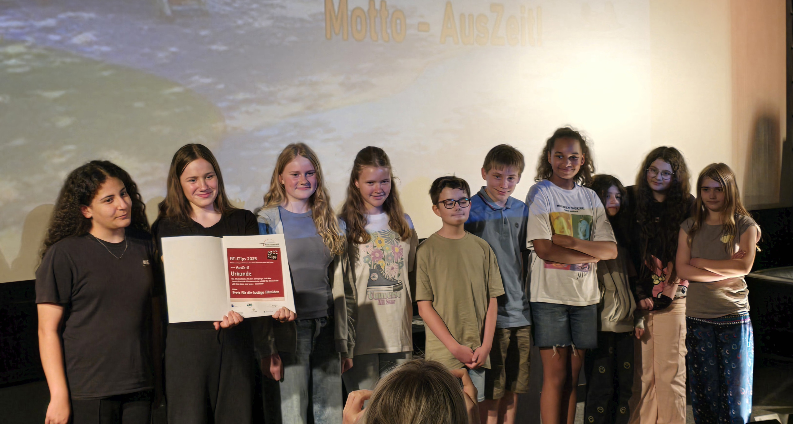 24 Kurzfilme wurden gezeigt. Die Mediotheks-AG ging gleich mit 2 Kurzfilmen ins Rennen. Nach einer kleinen Pause fand die feierliche Preisverleihung für 4 Kategorien statt. Die Mediotheks-AG gewann mit ihrem Film „Ich bin dann mal weg – innerlich“ in der Kategorie „Die lustigste Filmidee“.