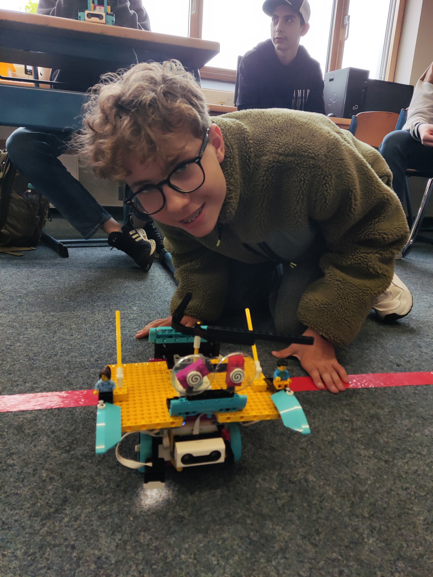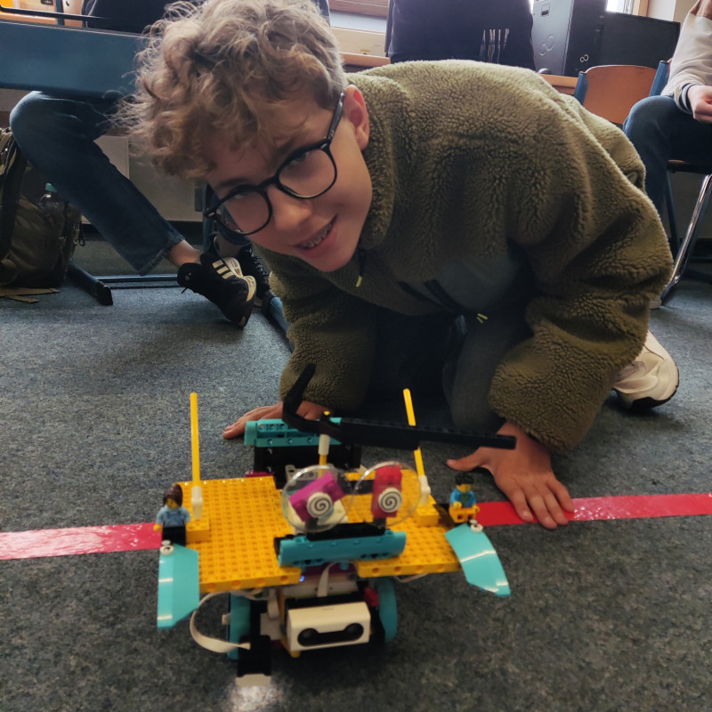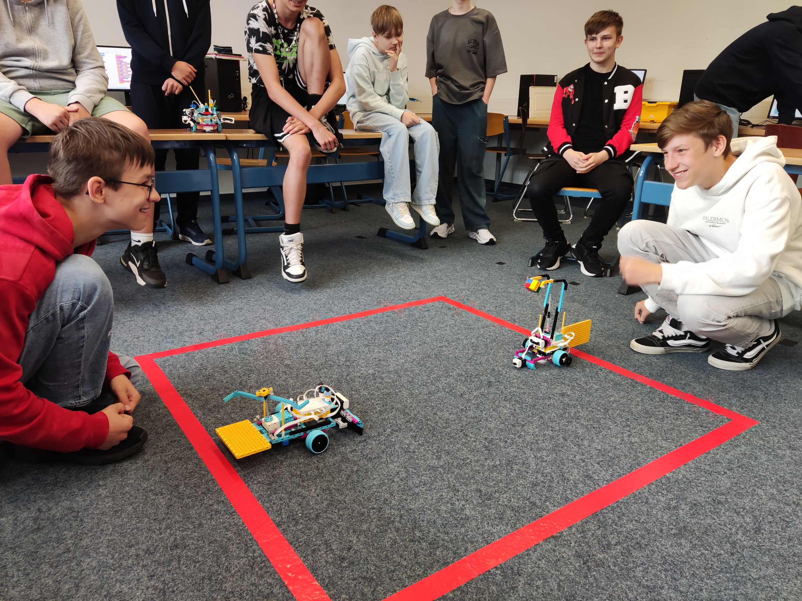 Mit den zehn im Schuljahr 2023/24 neu angeschafften LEGO® Education SPIKE™ Prime-Sets wurde eine praxisnahe Unterrichtsreihe umgesetzt, bei der Informatik lebendig wurde: In Zweiergruppen entwickelten die Jugendlichen Fahrzeuge, die selbstständig navigieren und gegnerische Roboter aus einem abgegrenzten Spielfeld – dem „roten Viereck“ – drängen sollten. Dabei kamen alle verfügbaren Bauteile und Sensoren zum Einsatz: Farb-, Ultraschall- und Drucksensoren sowie drei Motoren wurden kreativ verbaut und von den Schüler*innen selbstständig programmiert.