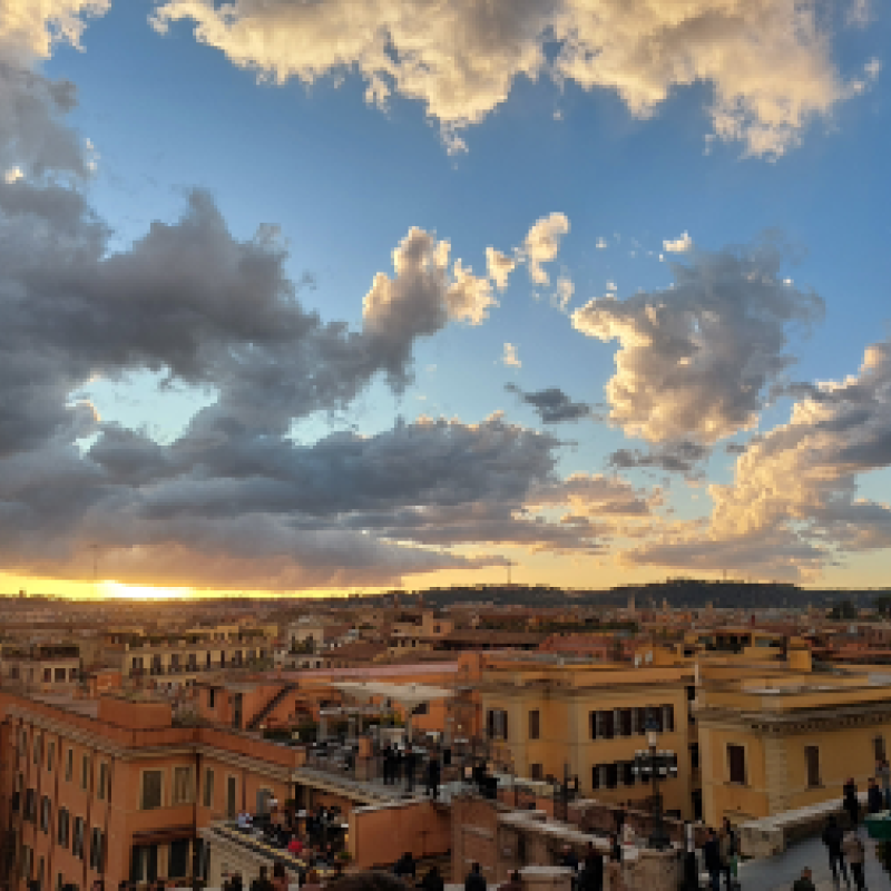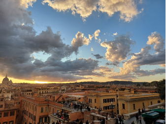 Weiter ging es dann ins Pantheon, einem antiken Tempel und daraufhin zur Spanischen Treppe, die 136 Stufen für die Touristen zum Aufsteigen bereithält. Oben angekommen hatten wir den schönsten Ausblick auf Rom, der durch einen wunderschönen Sonnenuntergang ergänzt wurde.