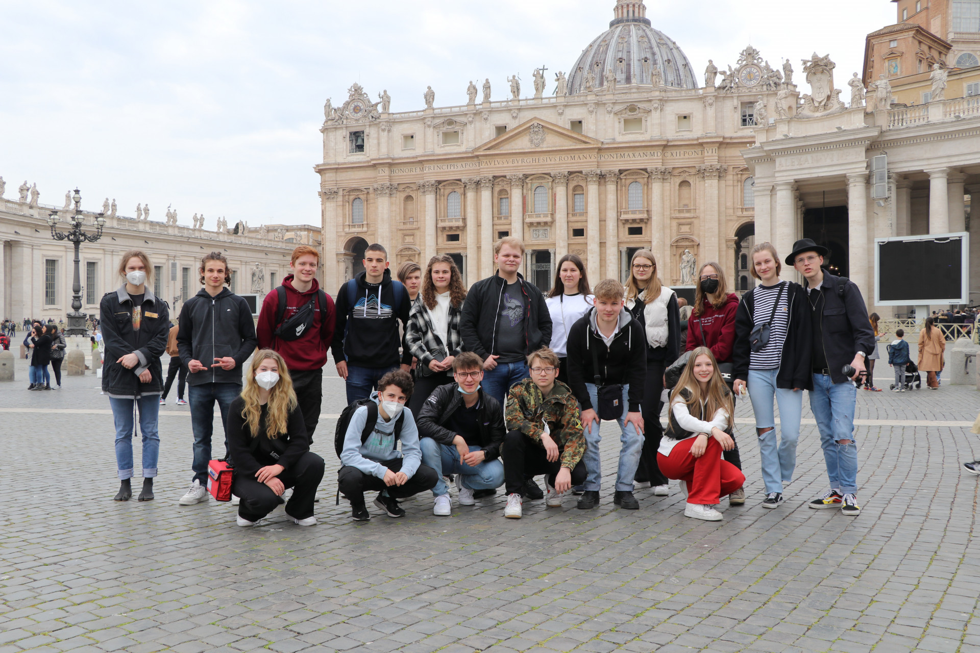 Nach 5 Jahren Latein erwartete uns nun endlich unsere lang erhoffte Belohnung, die Fahrt nach Rom. Pünktlich um Viertel vor 12 warteten wir voller Euphorie auf unseren Zug zum Düsseldorfer Flughafen, checkten nach der entspannten Fahrt problemlos ein und kurze Zeit später ging auch schon unser Flug nach Rom-Fiumicino. Nach der Landung und einem kurzen Zwischenstopp im Hotel wanderten wir schon zum nur knapp einen Kilometer entfernten Colosseum, das – im Dunkeln beleuchtet – einfach ein Hingucker war. Dass dort einst Gladiatorenkämpfe sogar Seeschlachten stattfanden, war kaum vorstellbar. Ebenso unvorstellbar waren die fast schon überfüllten Straßen und Gassen Roms, so viele Menschen auf einmal waren nach unserer langen Zeit mit Corona so ungewohnt wie noch nie. Müde und satt nach einer Pizza in einem nahegelegenen Restaurant ging es dann ins Bett, da der nächste Tag schon um 8:30 Uhr mit dem Frühstück starten sollte. Den Weg zum Petersdom legten wir mit der U-Bahn zurück, die uns auch direkt klar machte, dass wir uns nicht mehr im doch dann sehr klein wirkenden Gütersloh befanden, sondern in der Groß-und Hauptstadt Rom mit knapp 2,9 Millionen Einwohnern und unzähligen Touristen: So dicht standen wir schon lange nicht mehr aneinander. Angekommen waren wir aber noch lange nicht am Ziel unserer Reise. Auf uns wartete erst noch eine gefühlt Kilometer lange Warteschlange vor dem Petersdom. Wir waren aber von so viel Historie an einem Platz absolut überwältigt. Dass all diese Arbeit aus dem Jahre 1506 stammt und ohne moderne Maschinen oder sonstige technische Hilfsmittel erschaffen worden ist, war unbegreiflich und umso interessanter war es die feinsten Einzelheiten der Werke zu bestaunen.
