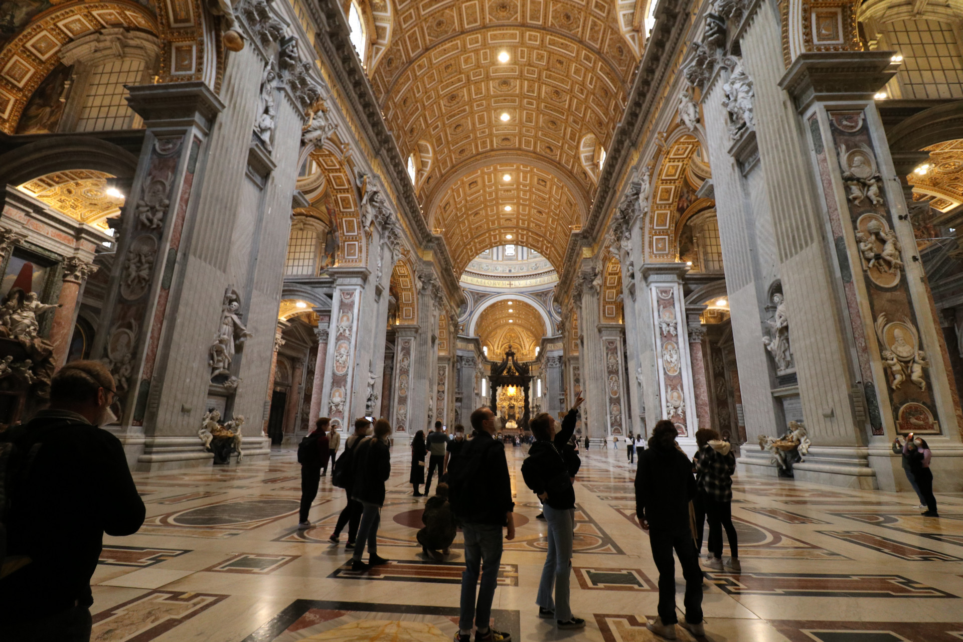 Im Petersdom angekommen bewunderten wir die Größe, die sich vor uns eröffnete. Die vergoldeten Decken mit Gemälden von Jesu mit Engeln und die realistisch fein gemeißelten Statuen von religiösen Idolen des Christentums, unvergleichbar. Für die historisch so bedeutende Grotte unterhalb des Petersdoms war der Eingang hierzu aber sehr unauffällig hinter einer der zahllosen übermenschlichen Statuen. In der Grotte lagen Särge mit Päpsten aus allen Epochen und mit den unterschiedlichsten Geschichten. Es war ein befremdliches Gefühl, vor Särgen zu stehen, in denen sich womöglich Überreste von Menschen befanden, die näher an Jesus Zeiten als an uns gelebt haben. Andererseits spürte man die Verbundenheit von Mensch und Glaube und man war dankbar, dass einem dieses Gefühl während Corona vermittelt wurde.