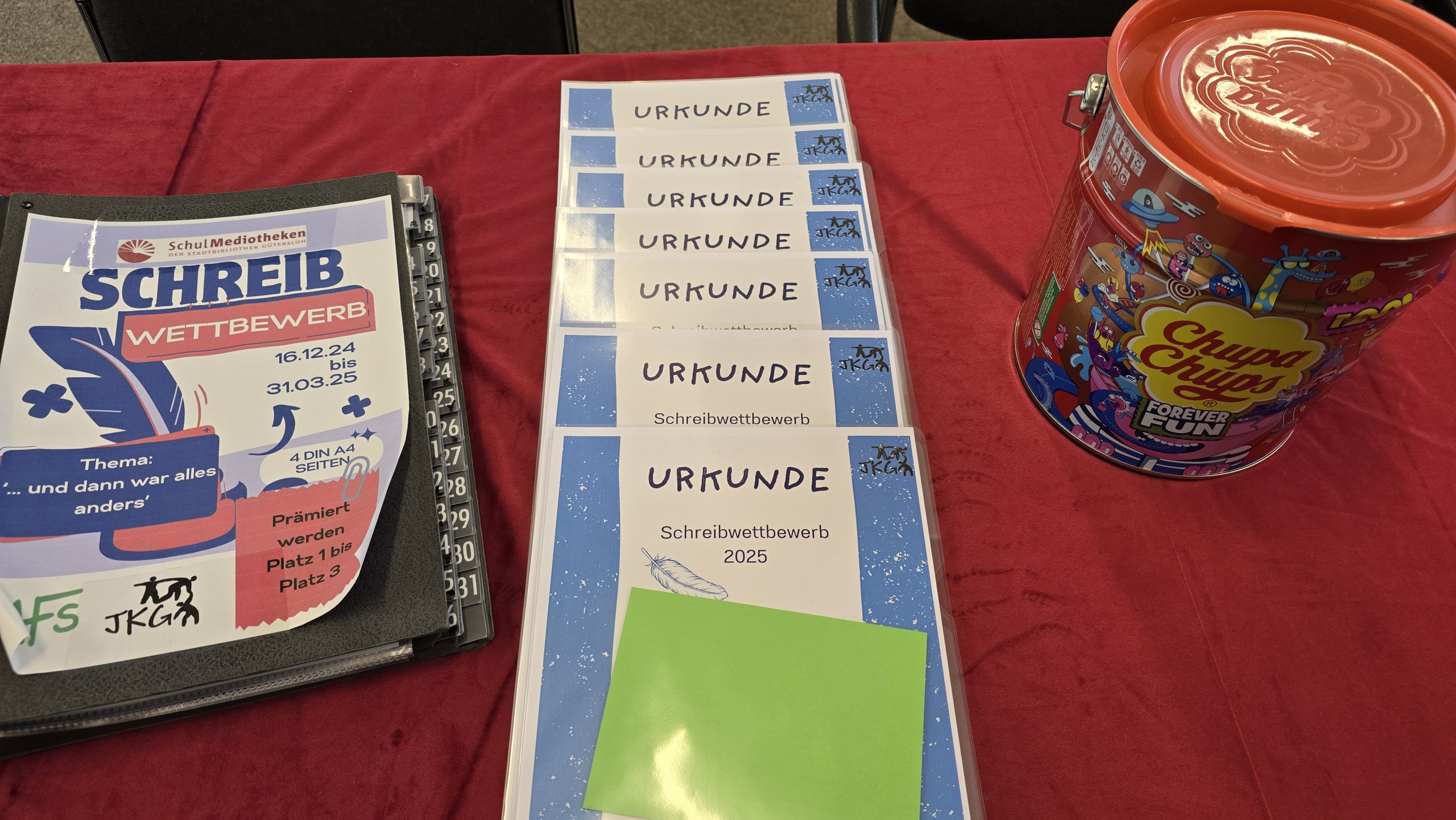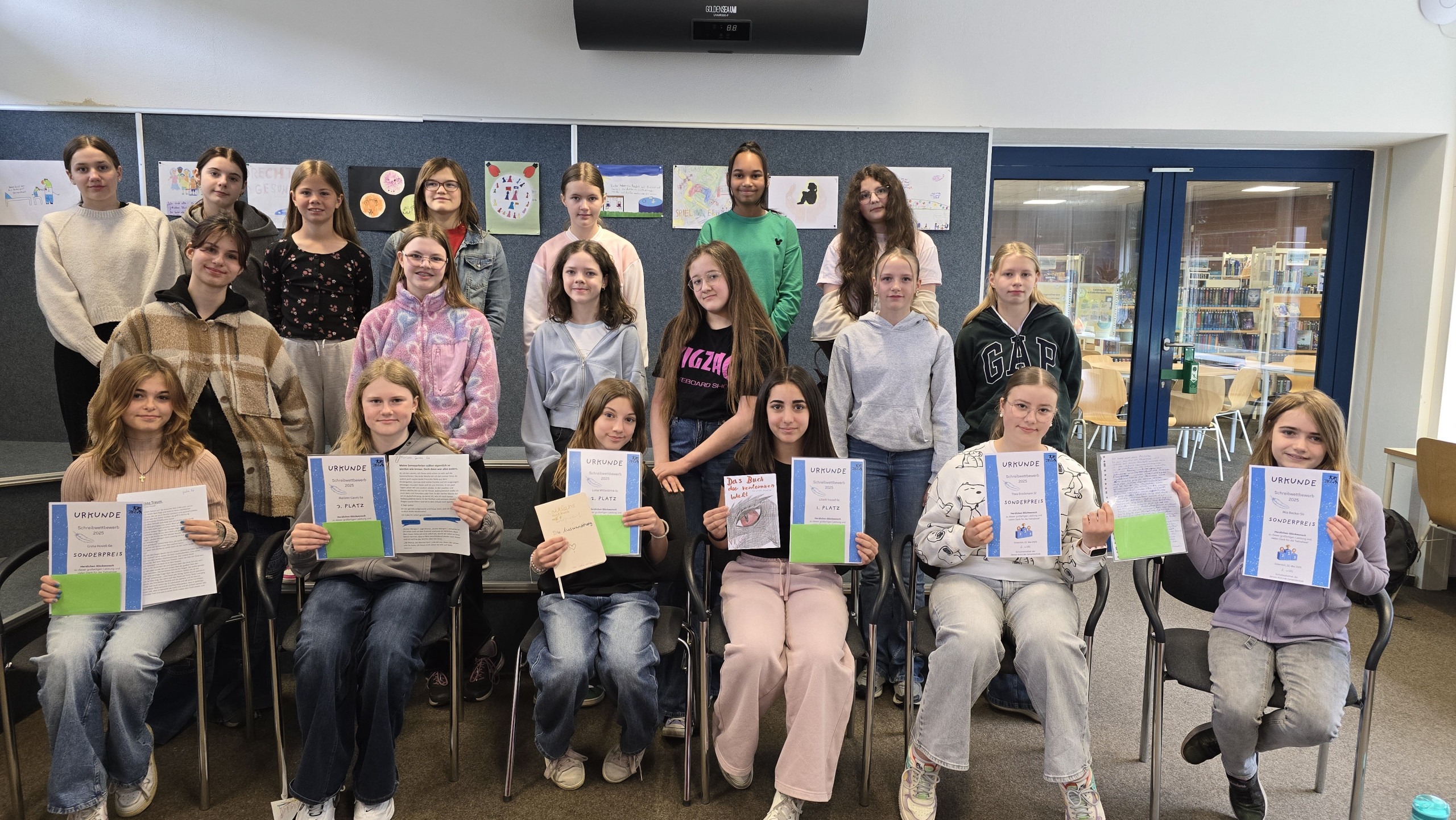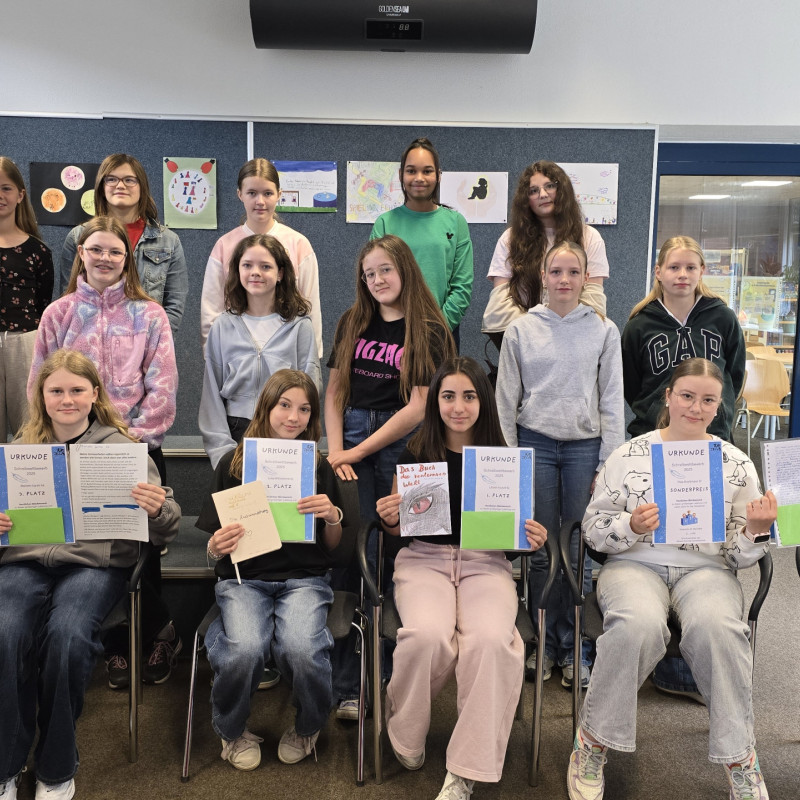 Am Donnerstag, 22. 05.2025 fand in der 2. Stunde die Preisverleihung zum diesjährigen Schreibwettbewerb statt. Die Jury (Frau Bordel-Soleimankhani, Frau Düllmann und Frau Witte) gaben in einer feierlichen Stunde im Selbstlernzentrum der Mediothek die Preisträger*innen bekannt und lasen die Siegergeschichten vor. Hier kamen alle 22 Zuhörer auf ihre Kosten. Einige Gewinnergeschichten werden auf der Schulhomepage der JKG veröffentlicht und können gerne gelesen werden. Herzlichen Glückwunsch!