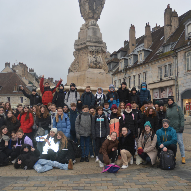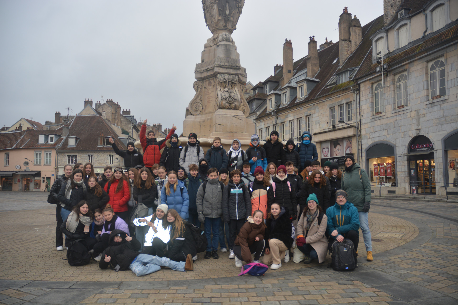 Nach mehreren Jahren Corona-Pause konnten wir wieder einen deutsch-französischen Schüler-Austausch durchführen – im Dezember kamen ja bereits unsere Gäste aus Frankreich; im Januar starteten 17 gut gelaunten 17 Schüler:innen in Begleitung von Dirk Rottmann und Tessa Böhl nach Frankreich zu unseren Partnerschulen in Amancey und Ornans. Dass unser erster Tag in Frankreich auf den 60. Jahrestag der Unterzeichnung des Elysée-Vertrages zwischen Charles de Gaulle und Konrad Adenauer gefallen ist, war zwar tatsächlich ein Zufall; allerdings profitieren auch unsere Schüler:innen von der Annäherung der beiden Politiker und tragen ja auch selbst zur Freundschaft beider Nationen bei. Von Adenauer und de Gaulle wurde auch das Deutsch-Französische Jugendwerk (DFJW) gegründet, das diesen Austausch auch finanziell unterstützt.