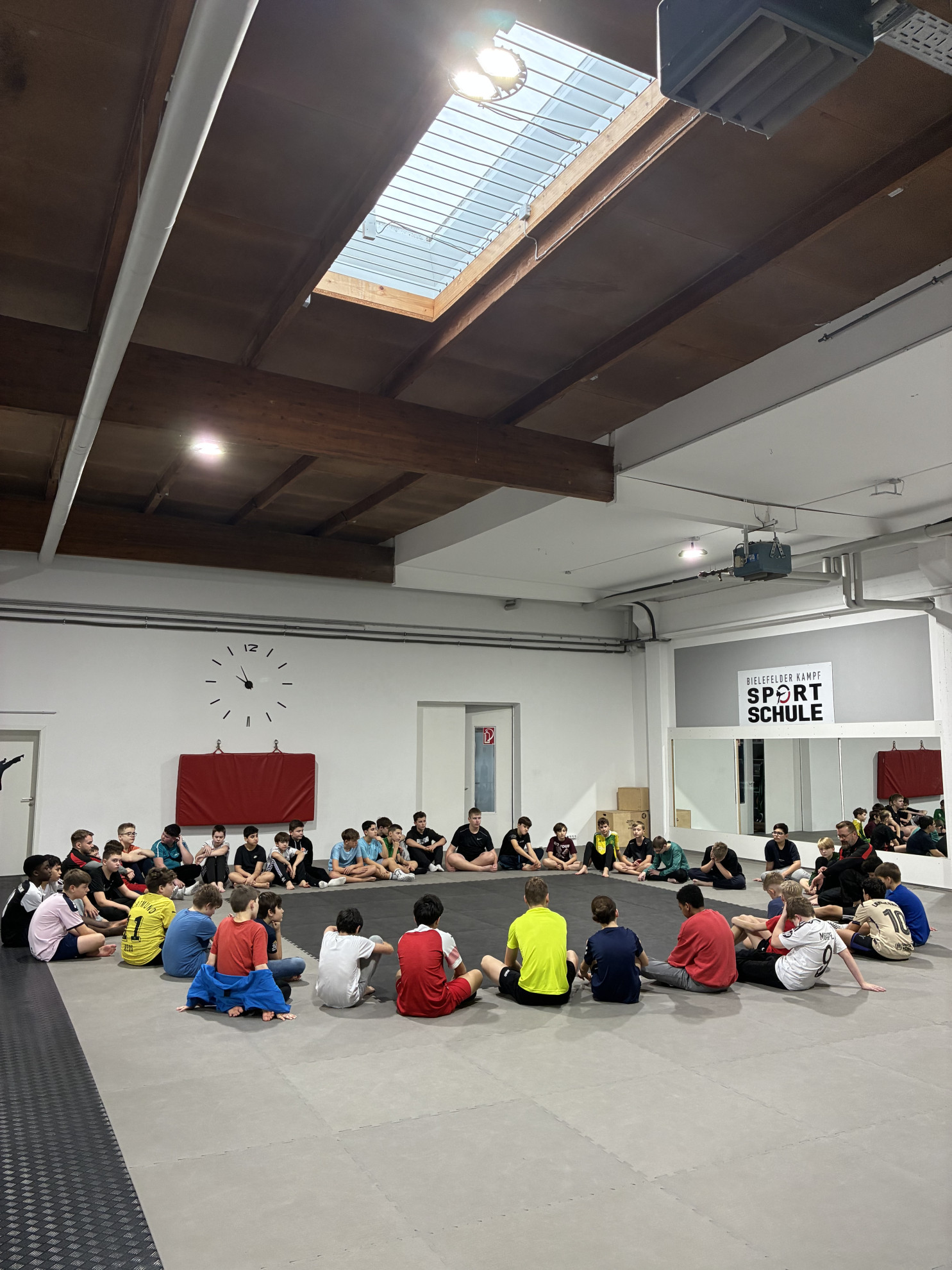 Parallel dazu absolvierten die Jungen ein Training in Kooperation mit der Bielefelder Kampfsportschule. Im Fokus standen Selbstbehauptung, Körpersprache und Deeskalationsstrategien. Zwar war auch das Kräftemessen ein Ziel, aber vor allem ging es darum, Situationen bewusst wahrzunehmen und angemessen einzuschätzen, um selbstbewusst und respektvoll handeln zu können. Der Trainer zeigte den Teilnehmern, wie sich die innere Haltung äußerlich ausdrückt, beispielsweise durch Blickkontakt, Körperausrichtung und Stimme. Mithilfe praktischer Übungen lernten die Teilnehmer, in kritischen Momenten ruhig zu bleiben, Grenzen zu setzen und zu akzeptieren, im Team verbunden zu bleiben sowie Verantwortung für sich und andere zu übernehmen.