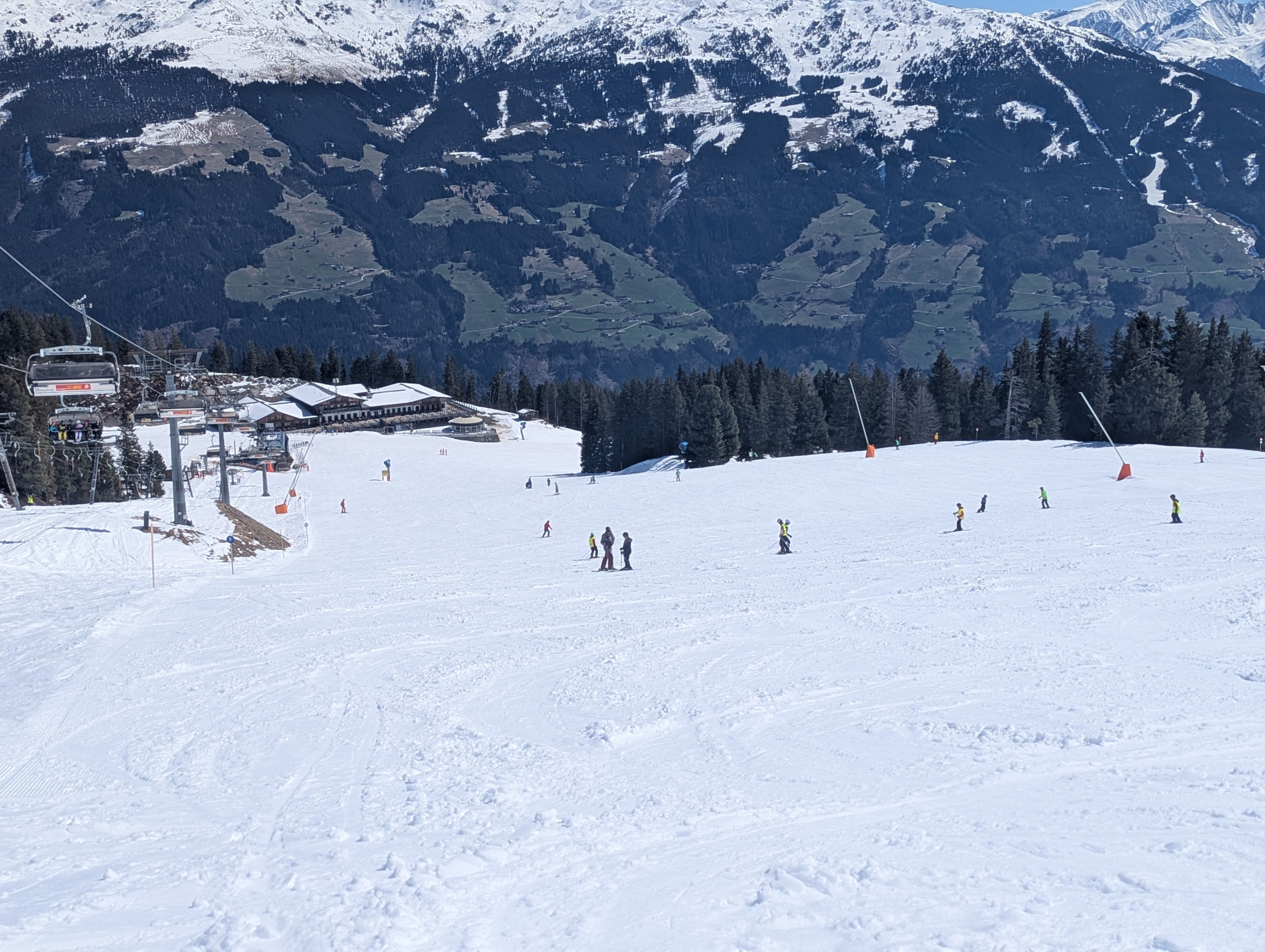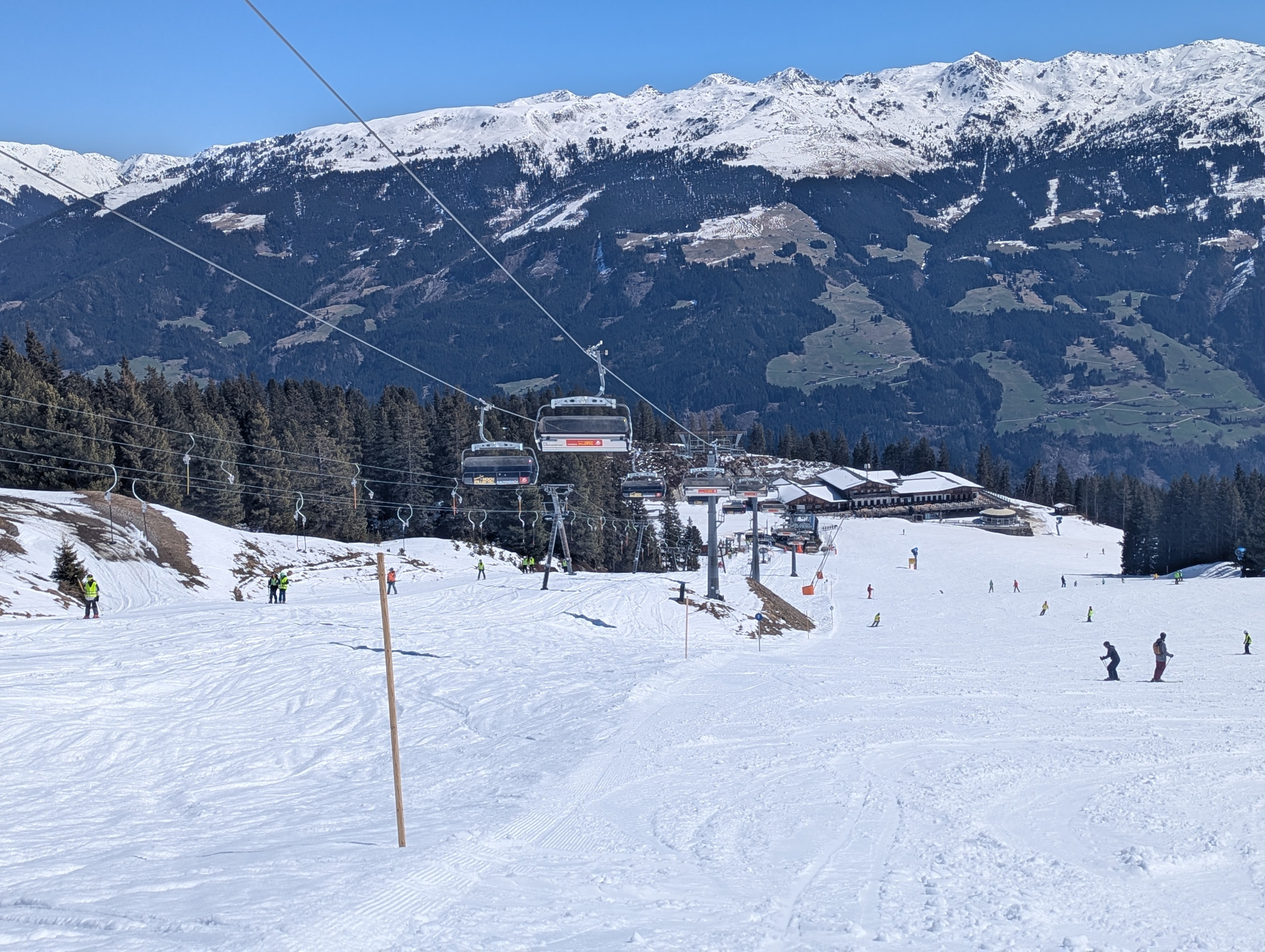 Die nächsten fünf Tage waren vom Ablauf immer gleich, um 6:45 Uhr Frühstück, gegen 7:40 Uhr stiegen wir in den Bus zum Skigebiet Hochzillertal-Kaltenbach und dann ging’s mit der Gondelbahn nach oben.