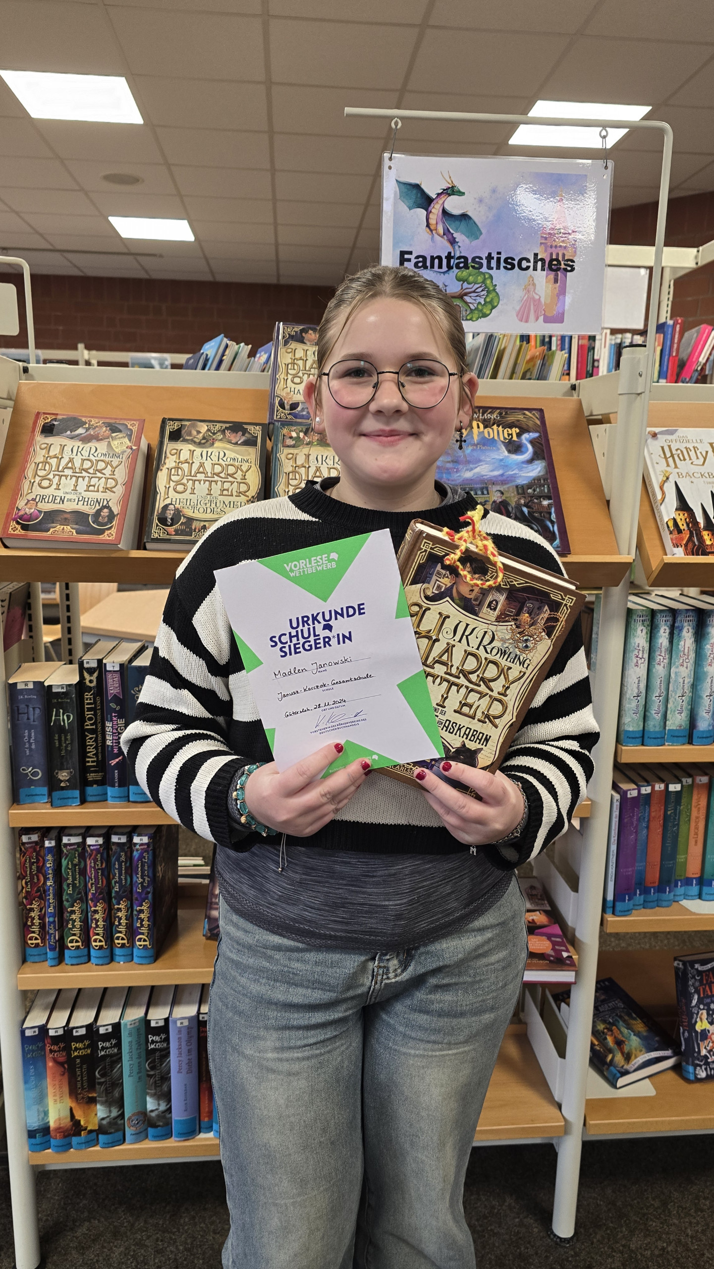 Alle klassen- und schulbesten Vorleser*innen wurden mit einer Urkunde ausgezeichnet. Die Schulsiegerin erhält beim Kreisentscheid im Februar 2025 zusätzlich ein besonderes Buchgeschenk als Preis.