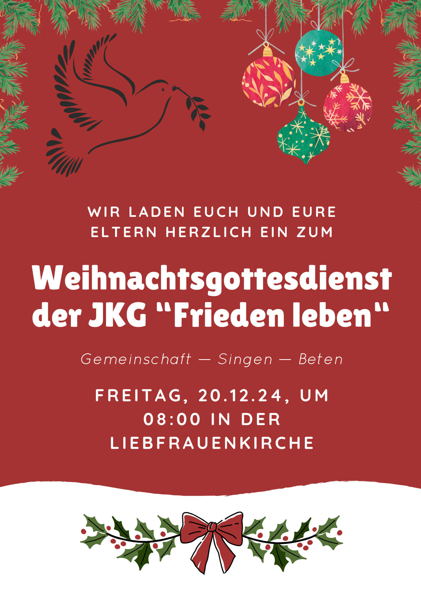 Wir laden alle Schülerinnen und Schüler, sowie Eltern und Erziehungsberechtigte herzlich ein, am 20.12. um 08:00 in der Liebfrauenkirche Weihnachtsgottesdienst mit uns zu feiern.