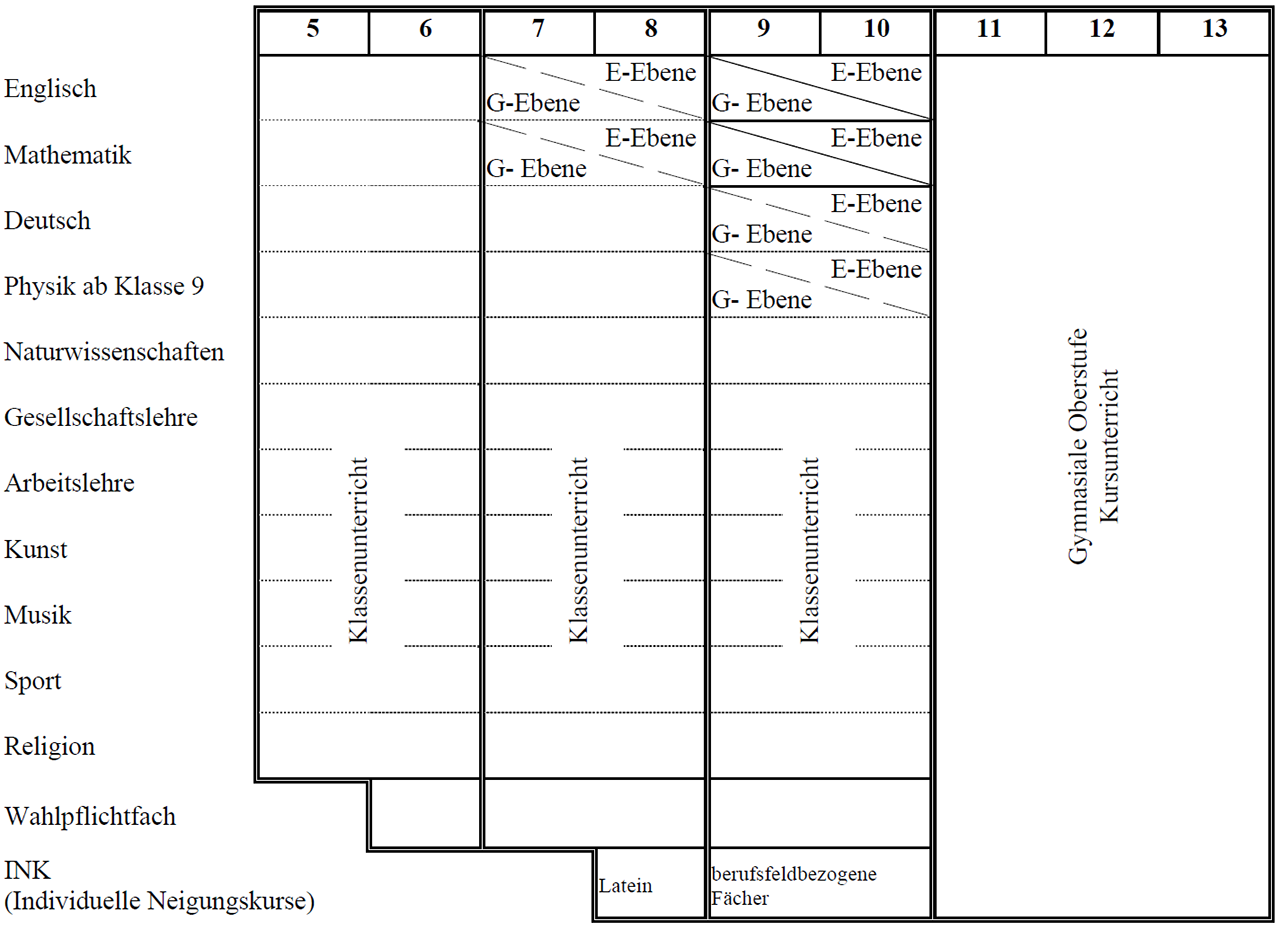- Ab Klasse 7 setzt die Fachleistungsdifferenzierung ein. Der Unterricht wird dann auf zwei verschiedenen Ebenen erteilt: Grundebene und Erweiterungsebene. Die Zuweisung zu den Ebenen entscheidet die Klassenkonferenz.