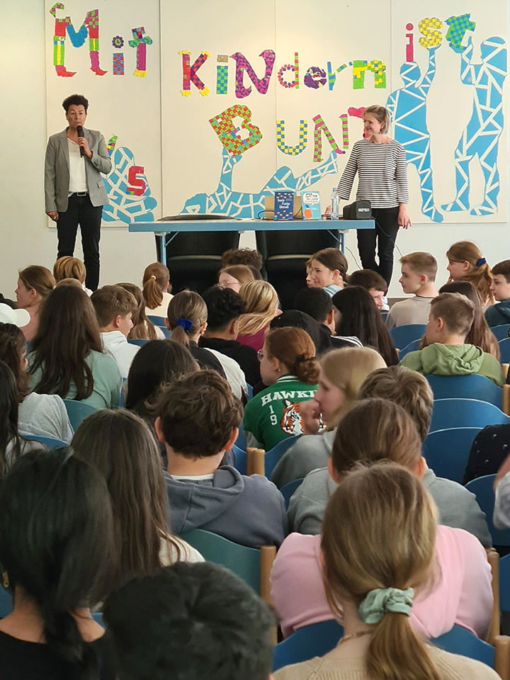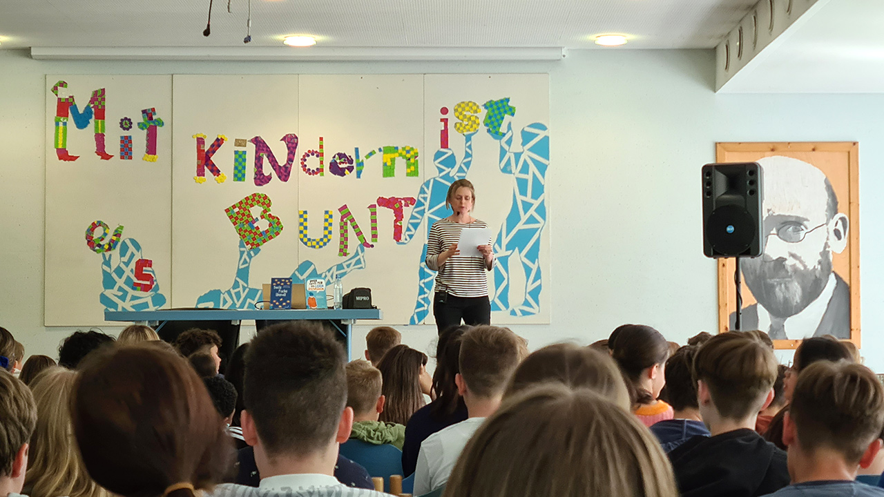 Am Dienstag, 16.05.2023 begeisterte Kathrin Schrocke rund 160 Schüler*innen in der Mensa mit einer lebendigen Hörspiel-Lesung: