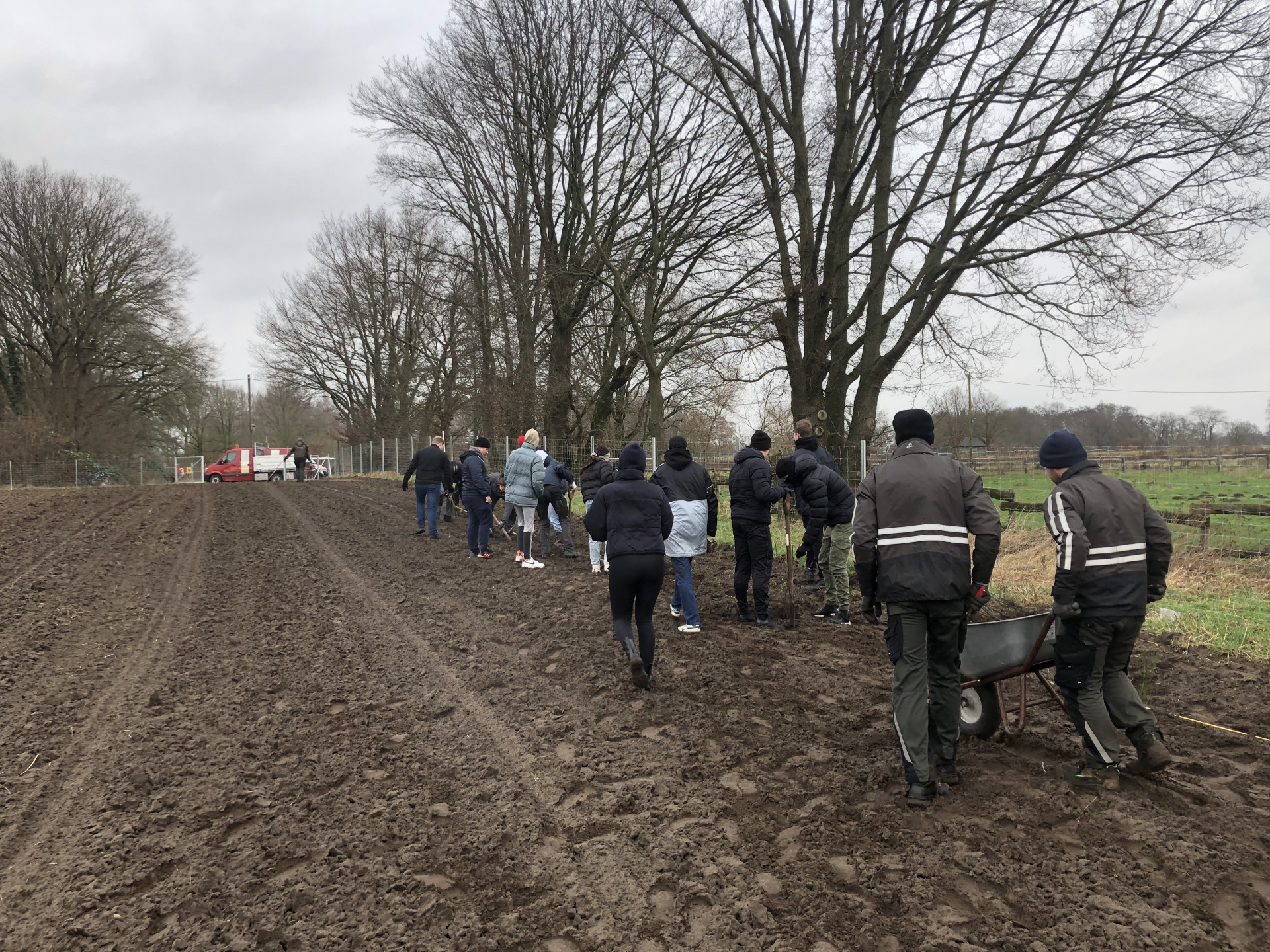 Herr Rüger, der Leiter des Projektes, sagte uns dazu, dass es darum ginge einen kleinen Beitrag gegen die Klimakrise und für ein grüneres Gütersloh zu leisten. „Dafür haben wir zunächst Überlegungen angestellt, wie wir ein solches Projekt organisieren und in Eigenverantwortung durchführen können. Nachdem einige Zeit in die Planungen investiert und viele Anrufe getätigt und Mails geschrieben wurden, wurde relativ schnell deutlich, dass die Organisation recht komplex ist“, so Herr Rüger. Zunächst musste eine passende Grundfläche her, die die Stadt zur Verfügung stellen kann und Spender die Bäume zu Verfügung stellen oder sie finanziell unterstützen. Als nächstes wurde das passende Equipment benötigt, also Schaufeln sowie anderer Gerätschaften, Arbeitsmaterial, etc. und fachmännische Unterstützung, die erklärt wie die Setzlinge richtig gepflanzt werden und was beachtet werden muss um es richtig zu machen. Diese Unterstützung konnten sie auch erhalten. So sagte Herr Rüger weiter: „Dabei wurde uns nach regem Austausch mit dem äußerst interessierten und entgegenkommenden Mitarbeiter des Grünflächenamtes der Stadt Gütersloh, Herrn Buddenberg, eine Möglichkeit eröffnet, wie wir unser Projekt umsetzen können.“ Zwar wurde ihnen keine „eigene“ Grünfläche zugesprochen, aber dafür haben sie eine Zusammenarbeit mit der Firma Schreiber (Garten- und Landschaftsbau) begonnen, durch die sie fachmännische Tipps und Unterweisungen bekamen. Die Firma Schreiber stellte ihnen daraufhin auch die benötigten Materialien und das benötigte Equipment zur Verfügung. Nachdem alles Organisatorische geklärt war, konnte das Projekt auch in die Tat umgesetzt werden. Am 1. Februar fand die Pflanzaktion auf der städtischen Fläche an der Straße „Lorenkamp“ statt. Um 9 Uhr begann die Aktion und die Schüler des Projekts wurden für den Tag von der Schulleitung vom Unterricht befreit. Dafür möchte sich Herr Rüger noch einmal bei der Schulleitung bedanken.