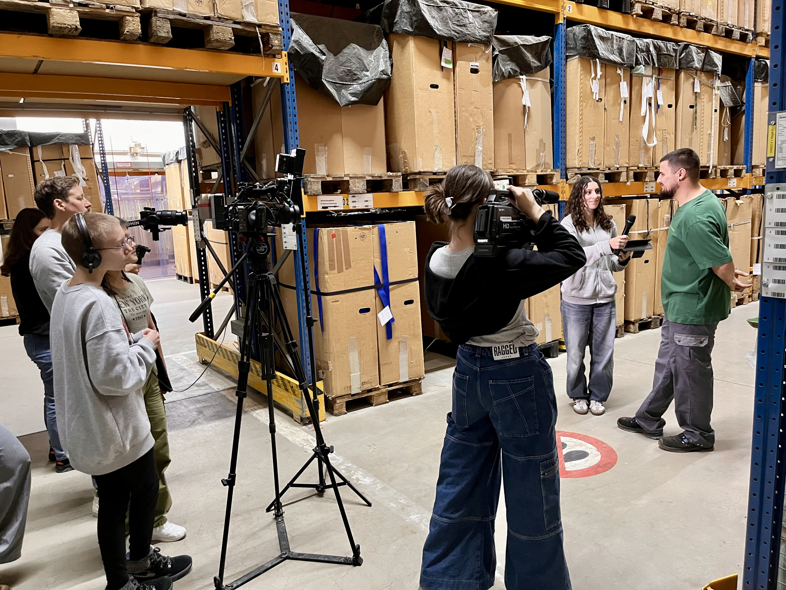 Von wegen leichtes Gepäck – ausgestattet mit Kameras, Lichtkoffern, Mikrofonen und jeder Menge Interviewfragen wurde das traditionsreiche Unternehmen Güth & Wolf zum spannenden Drehort für 10 Schülerinnen und Schüler der Janusz Korczak-Gesamtschule. Die Mission der vorweihnachtlichen Reise: Gemeinsam bildeten die Neunt- und Zehntklässler ein Produktionsteam im Rahmen des Workshops „Berufe-Klappe“, um ausgewählte Ausbildungsberufe der Gütersloher Band- und Gurtweberei filmisch darzustellen.
