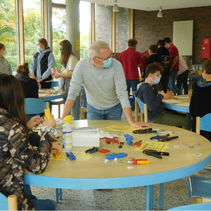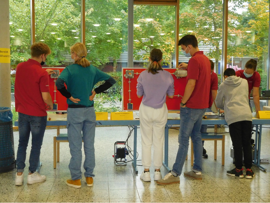Es wurde gesägt und geschraubt, Schaltkreise wurden erklärt und aktuelle Auszubildende aus verschiedenen Berufen demonstrierten, wie Fliesen „geschnitten“ und Steine aufeinander gemauert werden. Sie brachten den interessierten Jugendlichen Hintergründe der Elektronik näher und informierten mit spannenden Aufgaben über Ausbildungsberufe in der Textilindustrie.