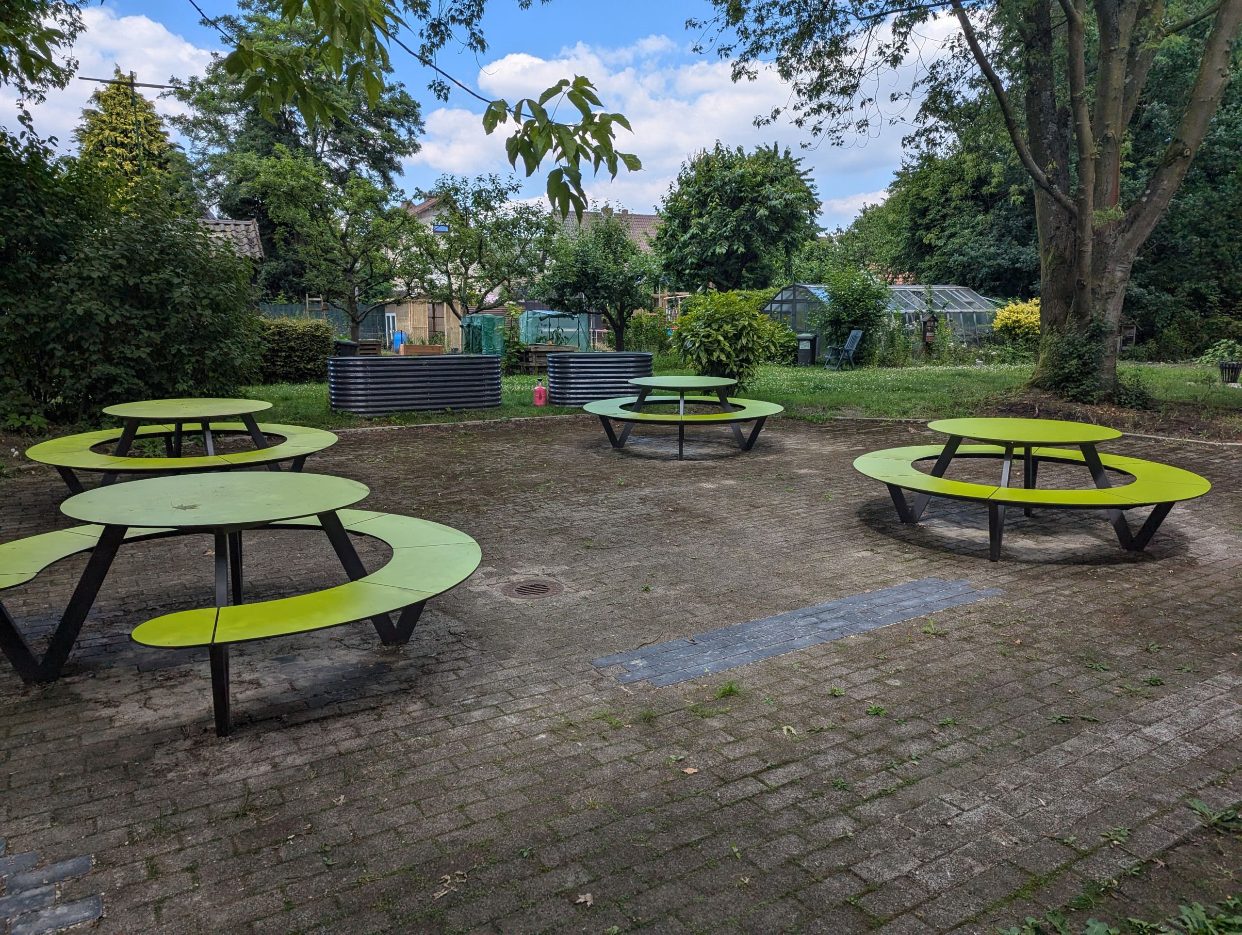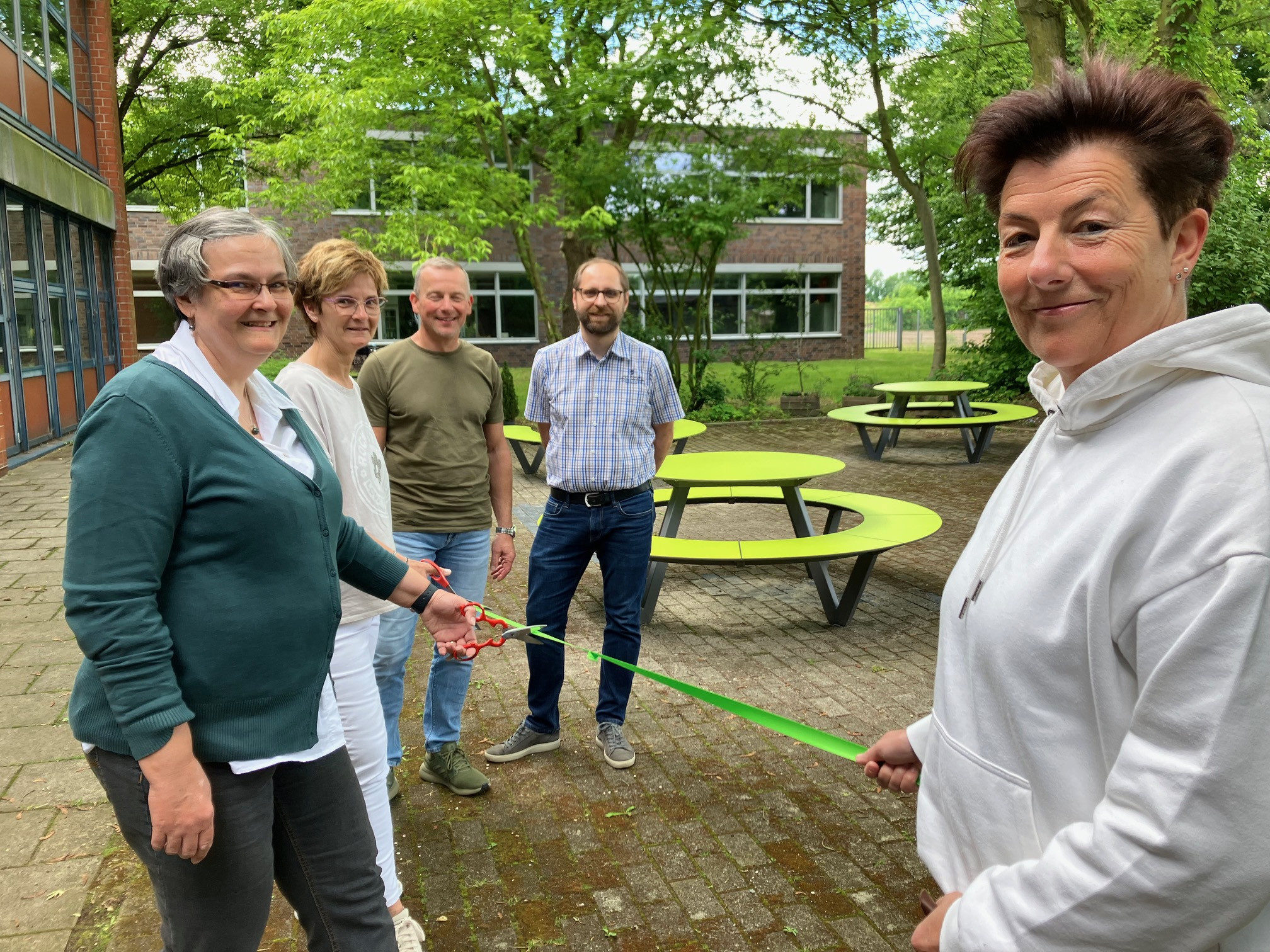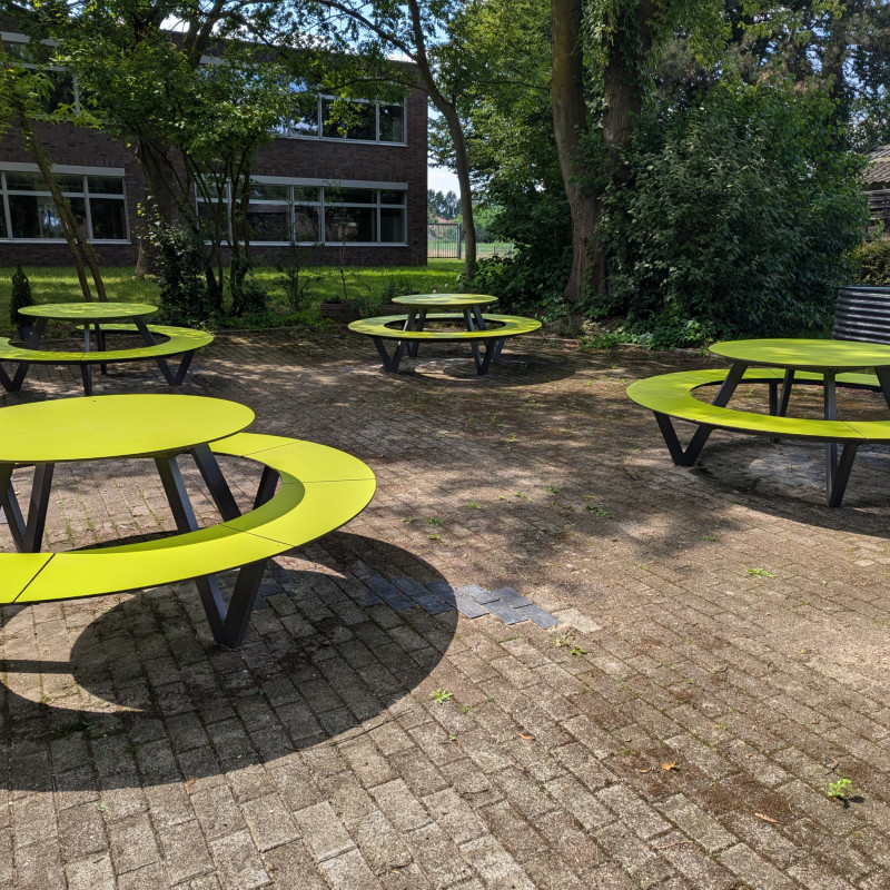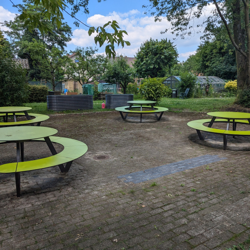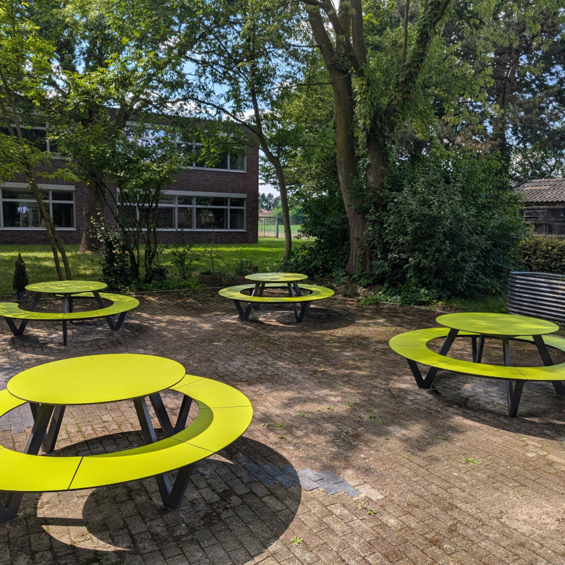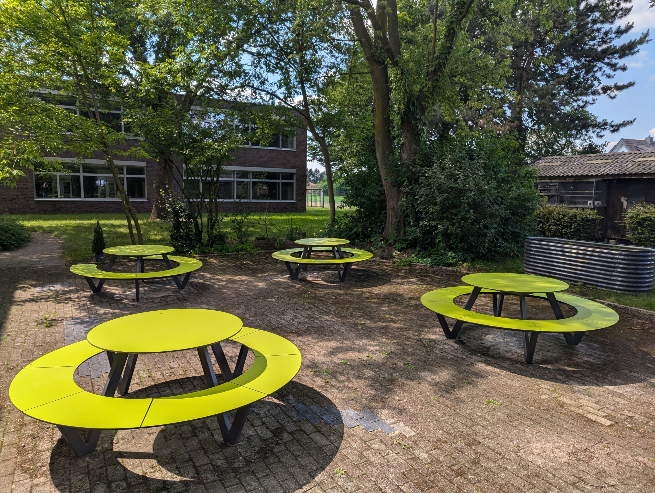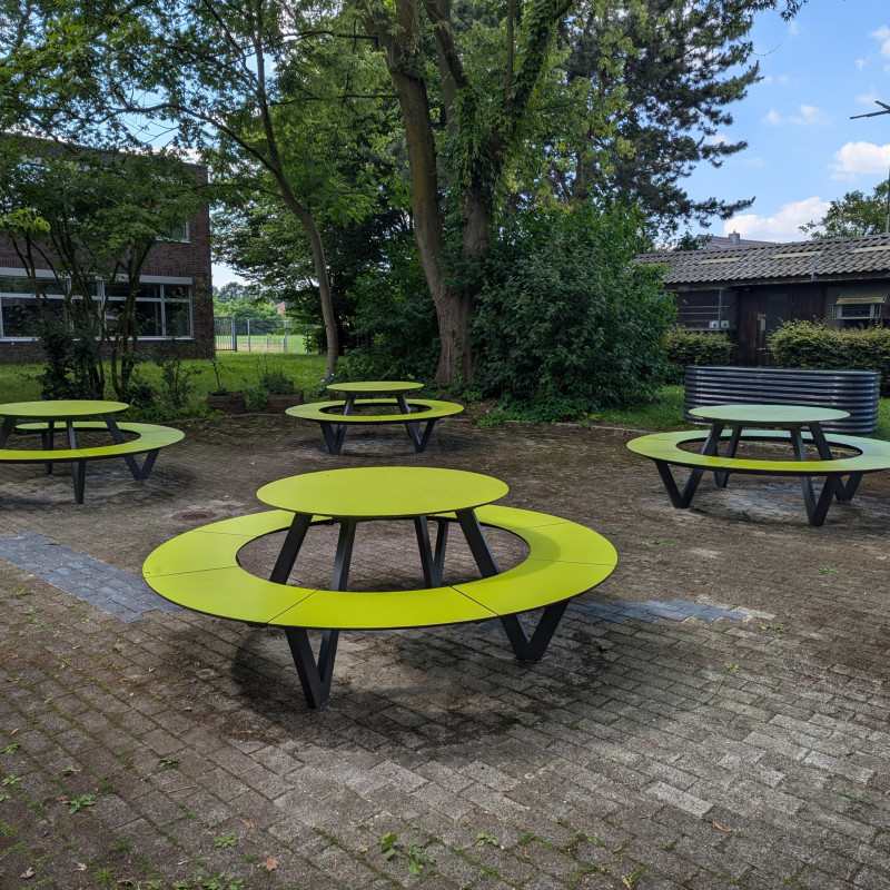 Wir freuen uns, dass wir wieder ein "Grünes Klassenzimmer" haben. Nachdem die alten Holzmöbel nach vielen Jahren nicht mehr nutzbar waren, machten wir uns auf, Außenmöbeln zu finden, die besonders witterungsbeständig sind. Wir stießen hierbei auf Möbel der Firma Miramondo. Die Möbel bestehen aus Hochdrucklaminat (HPL) und haben Eigenschaften, die für die Nutzung im Außenbereich prädestiniert sind.
