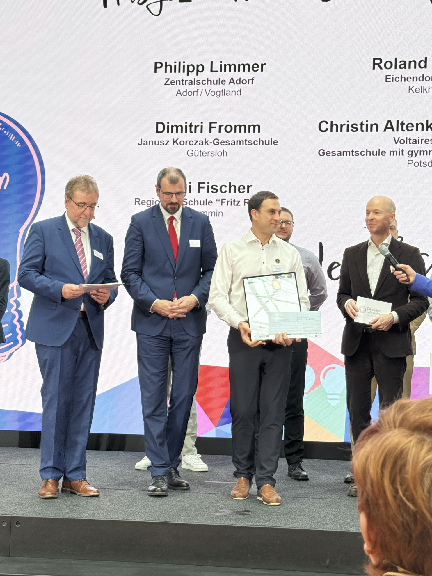 Zum 2.Mal nach dem Gewinn des Deutschen Lehrekräftepreise durch Annika Stuckmann, Laura Berressem und Lenny Liebig, die 2024 den Sonderpreis „Kulturelle Bildung” der PwC-Stiftung erhielten, gewann unser Physiklehrer Dimitri Fromm den Lehrkräftepreis 2025 in der Kategorie "Ausgezeichnete Lehrkraft".