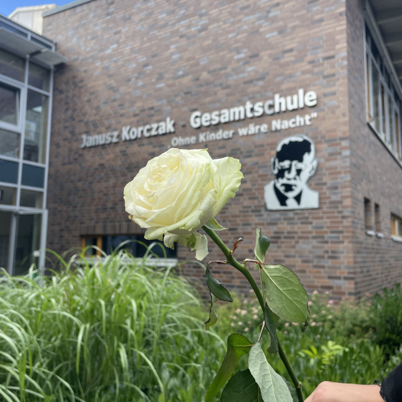 Den Abschluss des antifaschistischen Rundgangs bildete der Eingang unserer Schule. Janusz Korczak lebte zwar nicht in Gütersloh, aber er prägt unsere Schule jeden Tag.