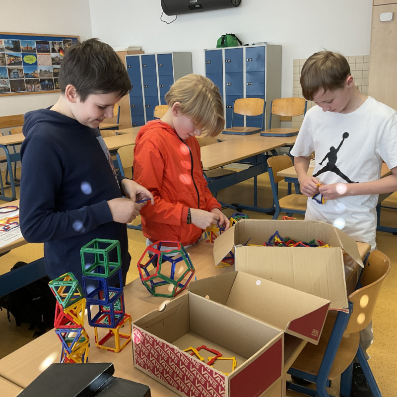 Die Gruppe „Platonische Körper" (Herr Robaczewski) baute sich durch die fünf klassischen geometrischen Körper, entdeckte dabei die Eulersche Polyederformel, beschäftigte sich mit konvexen und konkaven Körpern und wagte sich vereinzelt sogar an Archimedische Körper heran. Am Ende entstanden mathematische Kunstwerke, die eigentlich viel zu schön waren um sie wieder abzubauen.