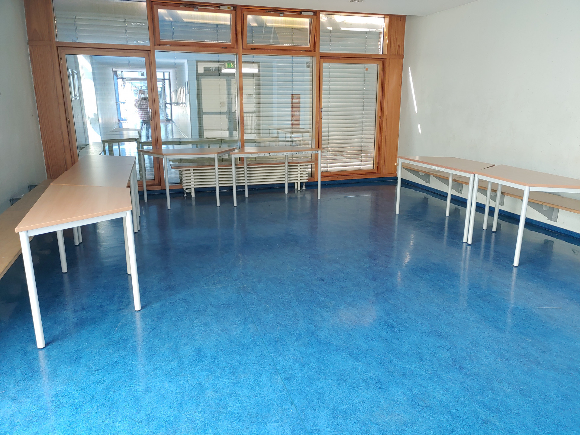Endlich ist es soweit. Der Umbau des Lichthofes im Bereich des 7. und 9. Jahrgangs ist beendet. Nun können Schülerinnen und Schüler diese Fläche durch die nun vorhandenen fest installierten Möbel deutlich besser nutzen. Die eigentlich als Aufenthaltsbereiche geplanten Lichthöfe in der Schule nutzen wir, aufgrund fehlender Differenzierungsräume, seit Jahren auch als weitere "Lernräume", die behelfsmäßig mit mobilen Tischen ausgestattet waren.