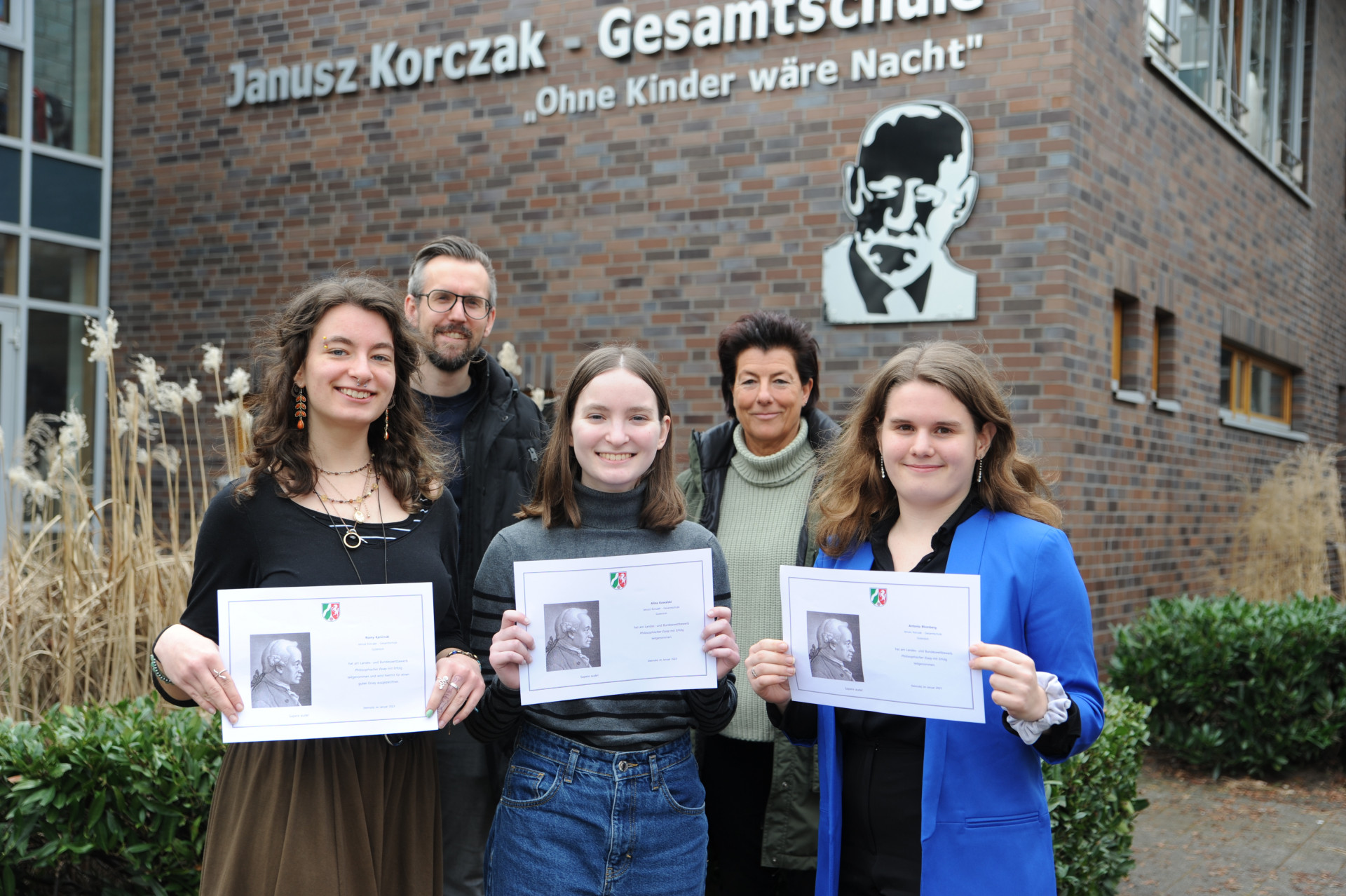 Im Herbst des vergangenen Jahres wählten die Schüler*innen aus einem Fundus von vier vorgegebenen Themen (siehe unten) eines zur Bearbeitung aus und verfassten einen schriftlichen philosophischen Essay. Im Anschluss bestimmten die Philosophielehrkräfte der JKG Alexander Becker und Julian Lienekampf die besten Essays aus beiden Philosophiekursen und übermittelten diese der Jury des Bundeswettbewerbs. Mitte Februar konnten sich Antonia Blomberg, Marcel Bienek (krankheitsbedingt fehlend auf dem Foto), Alina Viktoria Kowalski und Romy Kaminski über die Überreichung der Zertifikationsurkunden für die erfolgreiche Teilnahme am diesjährigen Wettbewerb freuen.