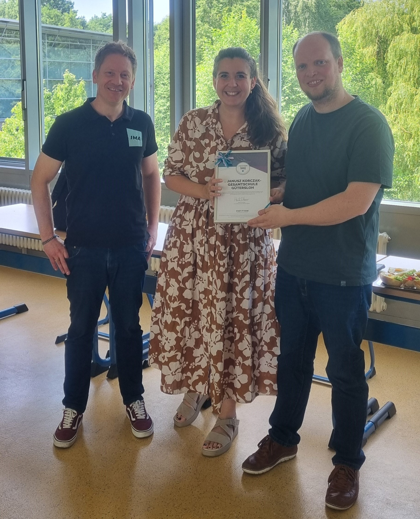 Außerdem fanden am vergangenen Mittwoch die Abschlusspitches des Projektkurses "Start-up-Schools" statt. Die Jury war dabei in diesem Jahr sehr fachkundig besetzt: Neben allen Kursmitgliedern nahmen auch Jörg Rodehutskors von der Innovationsmanufaktur Gütersloh und Nina Schweitzer von Startup Teens sowie Heidrun Elbracht an der Veranstaltung teil. Für die Projektteams gab es an diesem Tag viele hilfreiche Tipps, für die Schule gab es von Nina Schweitzer eine Urkunde. Die JKG ist damit nun STARTUP TEENS-Schule 2025, eine Auszeichnung, über die sich alle Beteiligten sehr freuten. Die Schule erhält diese Auszeichnung nicht zuletzt vor dem Hintergrund ihres Engagements in der Entwicklung von Konzepten für die unternehmerische Bildung, etwa im Rahmen des Projektkurses "Start-up-Schools".