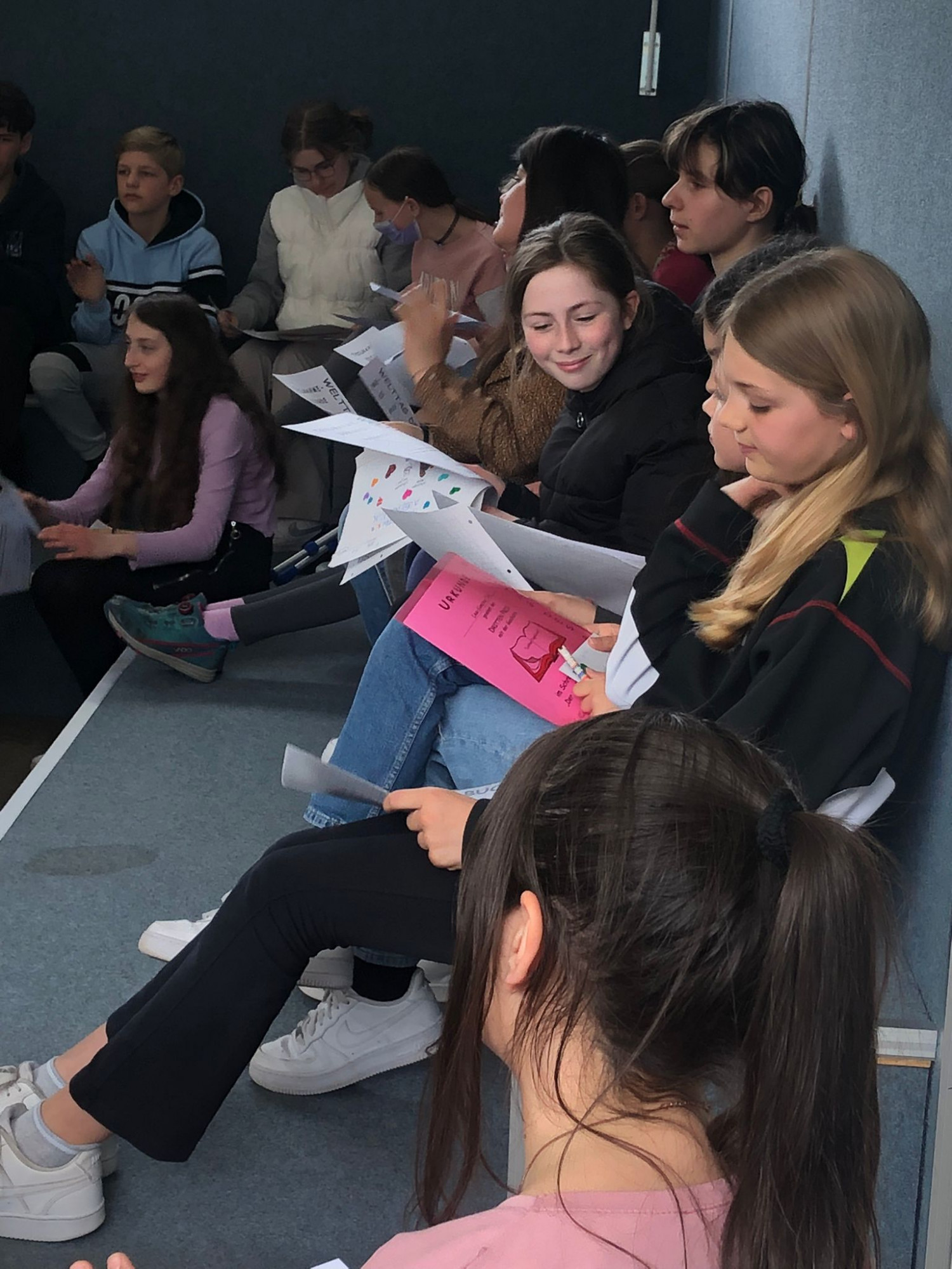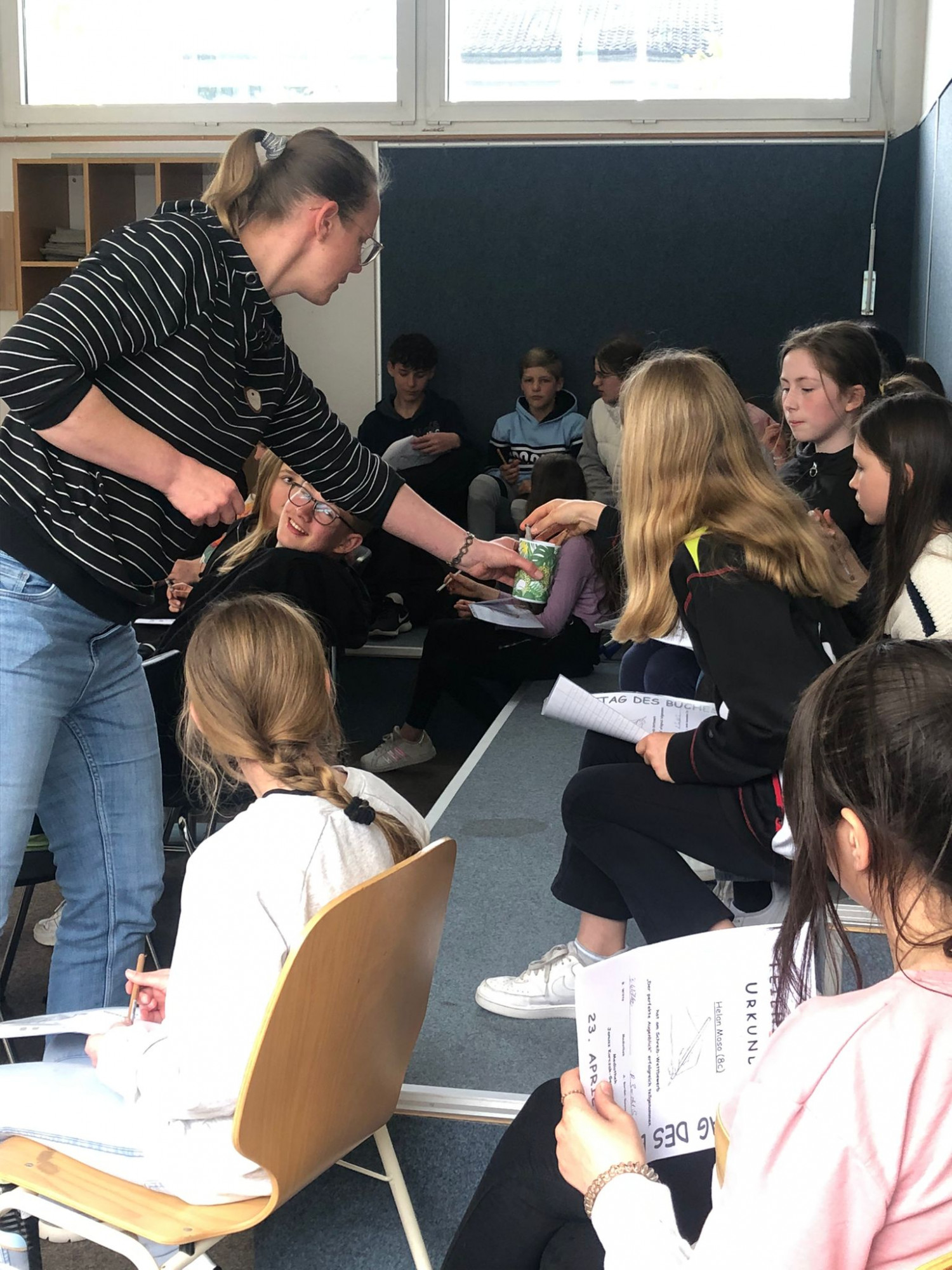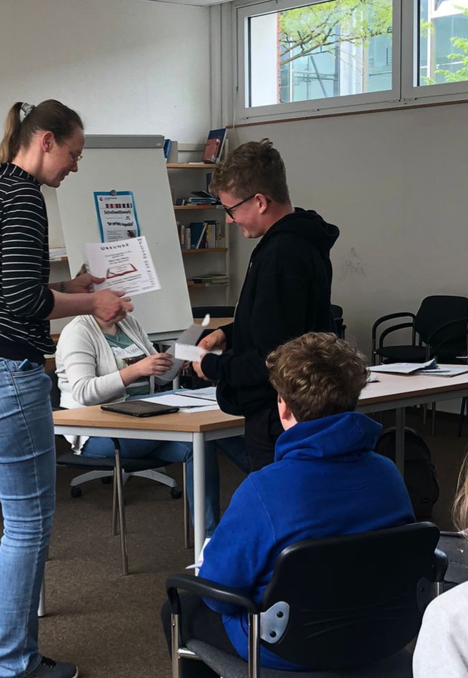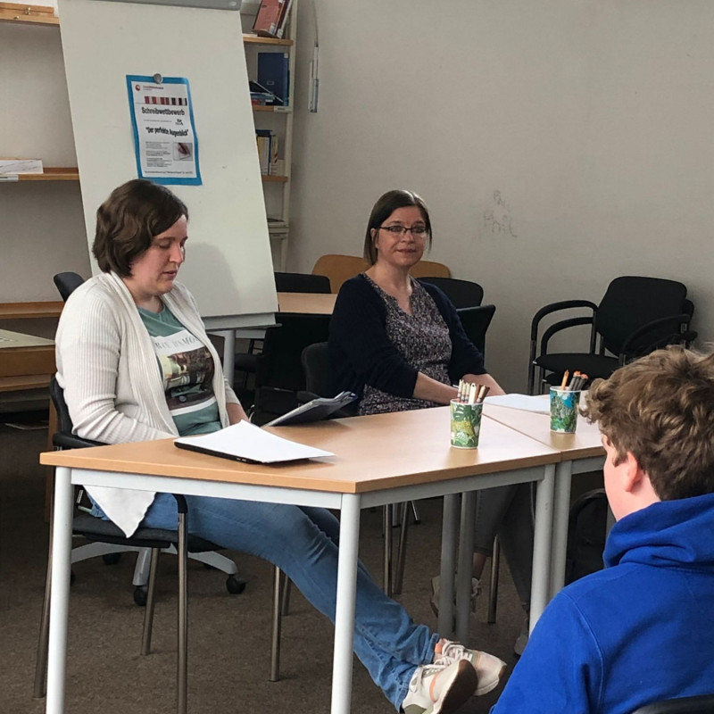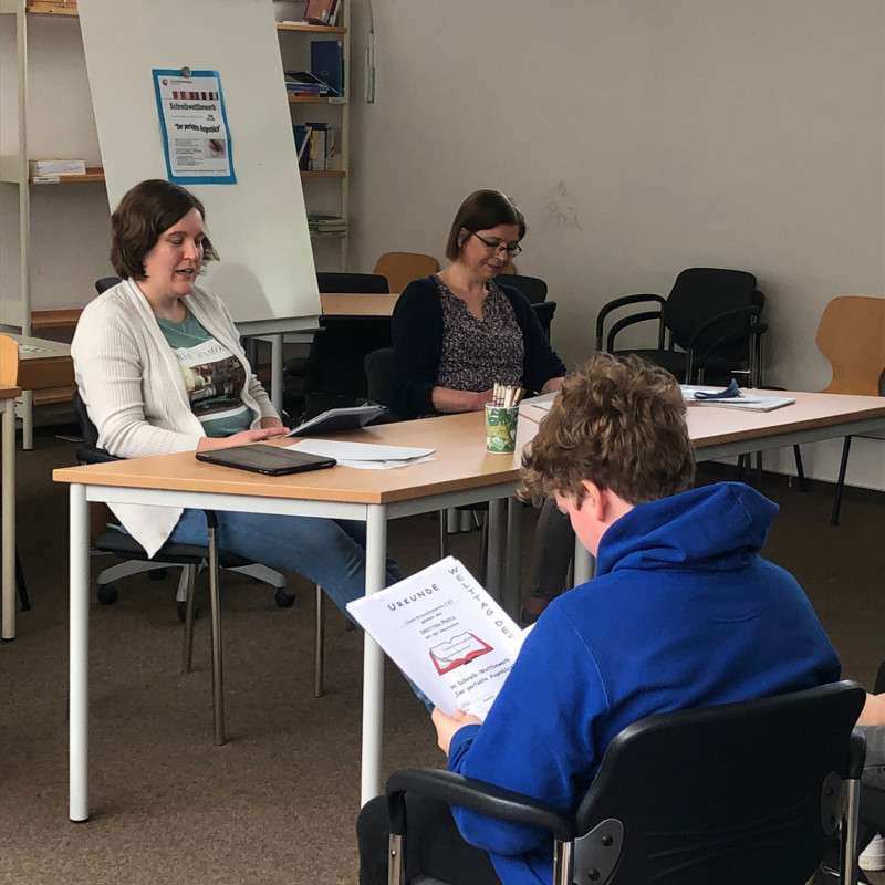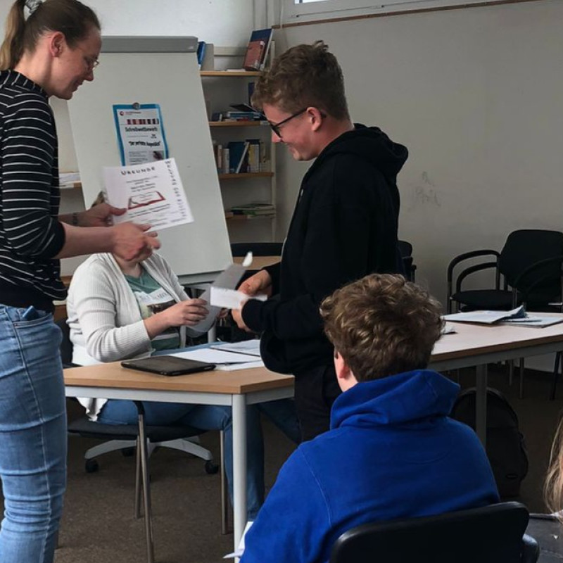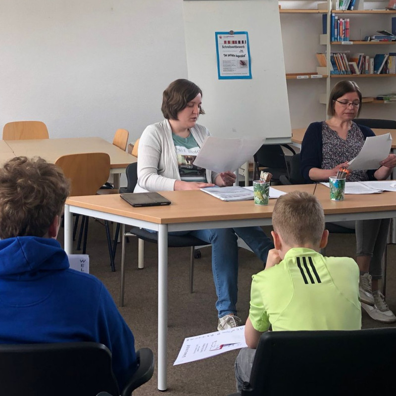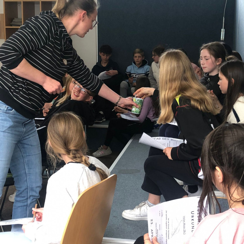 Die Preisverleihung für alle Teilnehmerinnen und Teilnehmer fand am Donnerstag, 04.05.2023 in der Mediothek statt. Hier wurden die Preisträgerinnen und Preisträger gewürdigt: Frau Bordel-Soleimankhani und Frau Düllmann lasen alle Gewinnergeschichten vor. Das verlieh der Veranstaltung einen feierlichen Rahmen. Im Anschluss erhielten die Preisträger*innen ihre Urkunden und Gutscheine. Alle Teilnehmer*innen erhielten zum Dank eine Teilnahme-Urkunde, sowie lustige Tierstifte, in der Hoffnung, dass sie mit diesen Stiften weitere Geschichten verfassen werden.