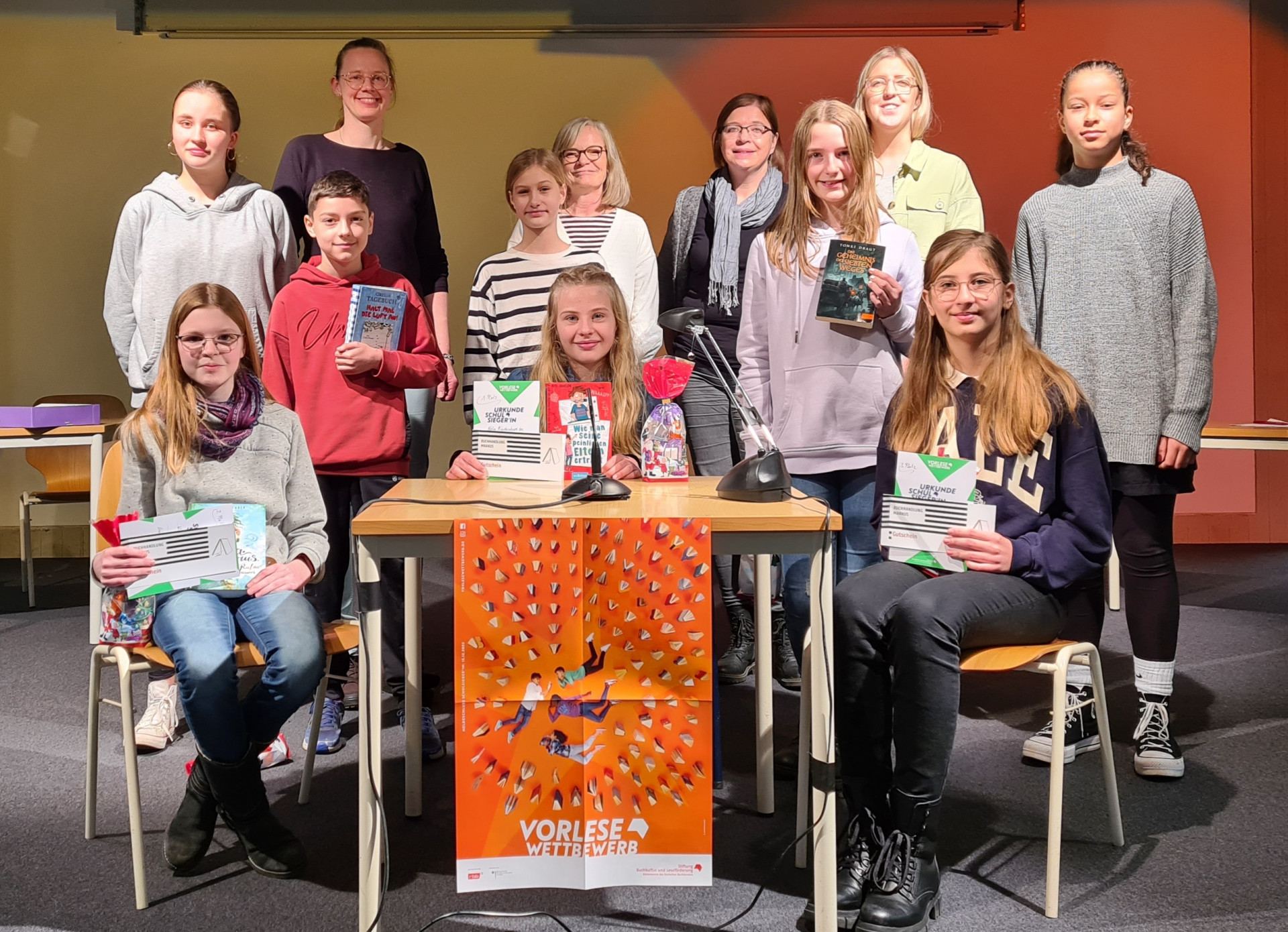 Am diesjährigen Vorlesewettbewerb haben 45 Schülerinnen und Schüler teilgenommen. Mit Buchvorstellungen und dem Vorlesen ausgewählter Textstellen haben die Kinder beim Klassenentscheid das Publikum unterhalten. Die Jury (Schüler, Deutschlehrer und Frau Witte (Schulbibliothek)) bewertete Lesetechnik, Textverständnis und Textgestaltung und war von den Beiträgen beeindruckt.