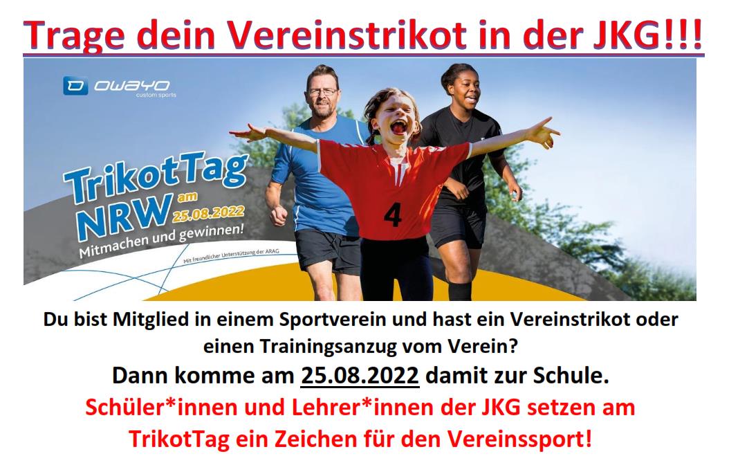 TrikotTag am 25.8.2022 Geschrieben von Christoph Steibelmüller am 29.08.2022. Teilen Home Aktuelles TrikotTag am 25.8.2022 Eine Aktion des Landessportbunds NRW Eine kleine Auswahl an Vereinstrikots präsentierten sowohl Schülerinnen und Schüler als auch Lehrerinnen und Lehrer in der Frühstückspause auf dem Soccer-Court. Teilen Vorheriger Artikel Einschulung des neuen 5. Jahrgangs Nächster Artikel Schreibbegeisterte Jugendliche aufgepasst: Kostenlose Schreibwerkstatt in den Herbstferien!